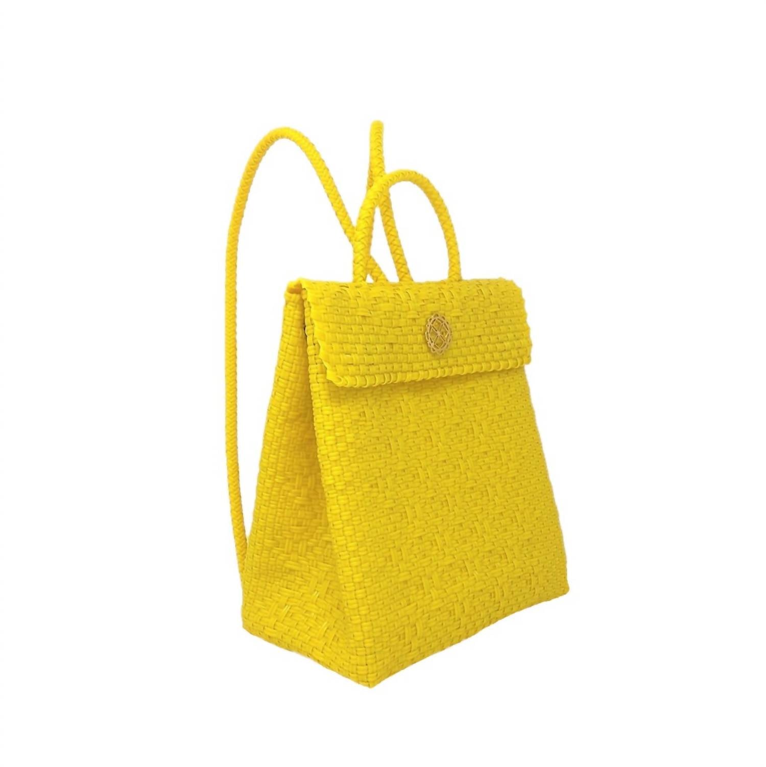 Introducing the Women's Native Backpack by Lola's Bag, meticulously handcrafted by native artisans from Southeast Mexico. This vibrant yellow backpack is woven from recycled plastic, featuring braided top handles and a magnetic clasp closure, enhanced with 24k gold or .925 sterling silver plated medallions. Available in medium size (10 in x 5.5 in x 10.5 in) or small size (9 in x 4.6 in x 7 in), each bag is lightweight, waterproof, and durable. Care: Hand wash recommended.