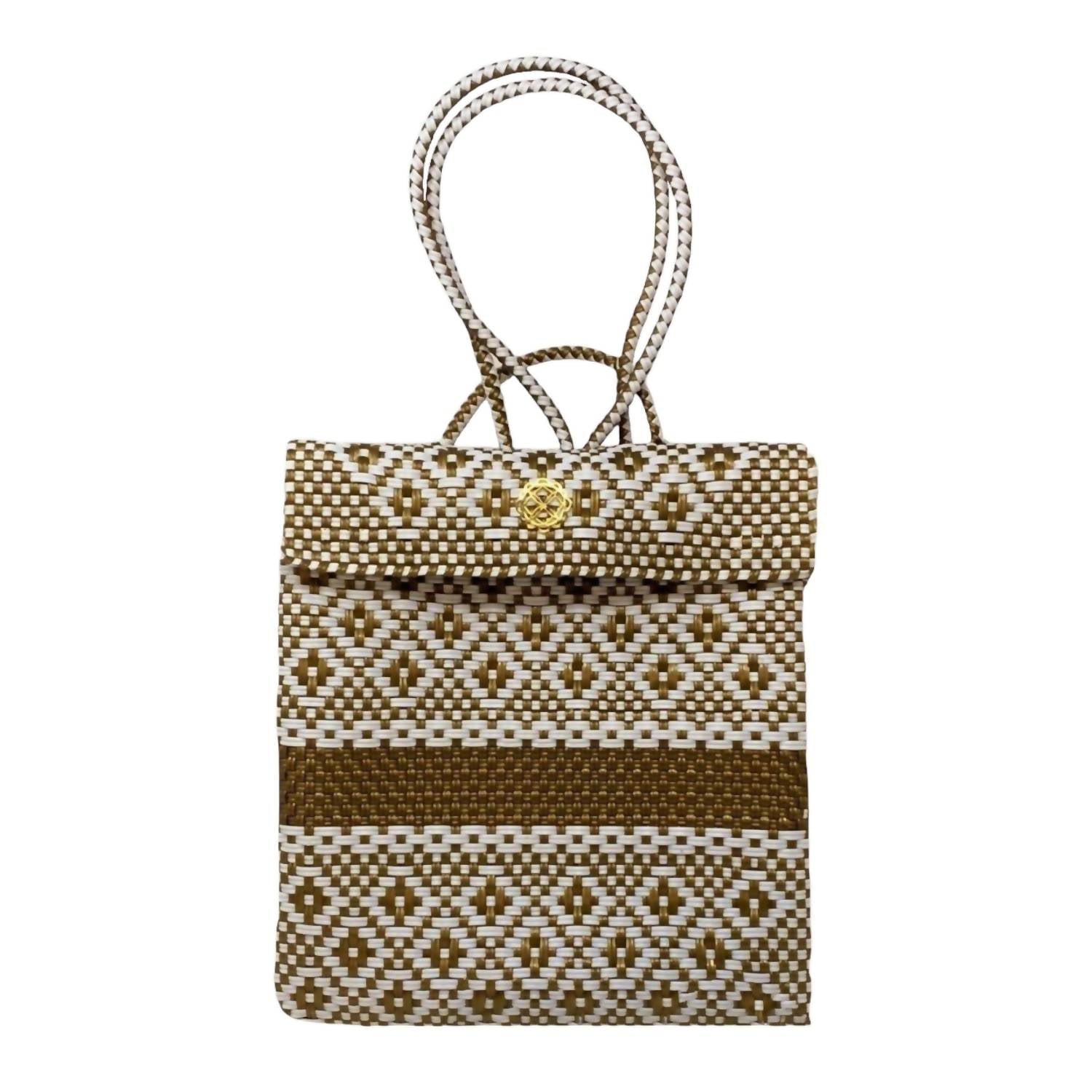 A backpack so versatile, you'll want to carry this with you everywhere. Discover the Women's Native Backpack by Lola's Bag, a unique blend of tradition and style in Yellow Aztec. Handcrafted by skilled artisans from Southeast Mexico, this backpack is meticulously woven from recycled plastic, featuring braided top handles and a magnetic clasp closure. It is lightweight, waterproof, and durable, making it an ideal choice for everyday use. Dimensions are approximately 10 in x 5.5 in x 10.5 in for medium size and 9 in x 4.6 in x 7 in for small size, with a care suggestion to hand wash for cleaning.