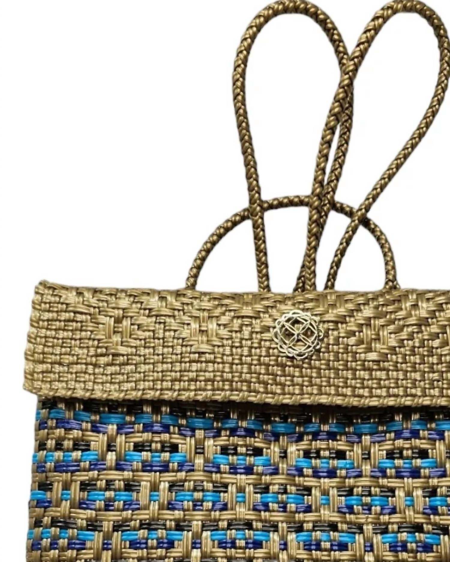 A backpack so versatile, you'll want to carry this with you everywhere. Discover the Women's Native Backpack by Lola's Bag, a unique blend of tradition and style in Yellow Aztec. Handcrafted by skilled artisans from Southeast Mexico, this backpack is meticulously woven from recycled plastic, featuring braided top handles and a magnetic clasp closure. It is lightweight, waterproof, and durable, making it an ideal choice for everyday use. Dimensions are approximately 10 in x 5.5 in x 10.5 in for medium size and 9 in x 4.6 in x 7 in for small size, with a care suggestion to hand wash for cleaning.