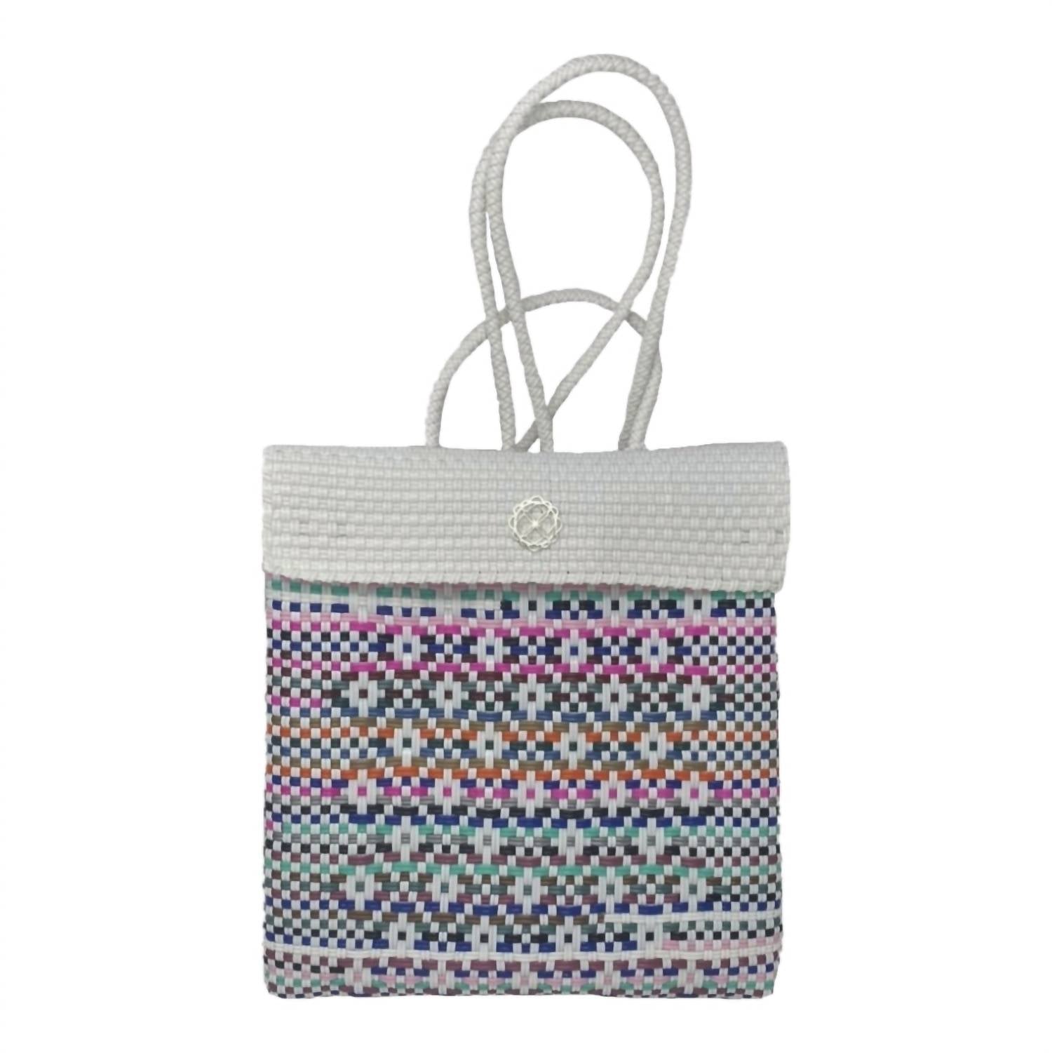 A backpack so versatile, you'll want to carry this with you everywhere. Discover the Women's Native Backpack by Lola's Bag, a unique blend of tradition and style in Yellow Aztec. Handcrafted by skilled artisans from Southeast Mexico, this backpack is meticulously woven from recycled plastic, featuring braided top handles and a magnetic clasp closure. It is lightweight, waterproof, and durable, making it an ideal choice for everyday use. Dimensions are approximately 10 in x 5.5 in x 10.5 in for medium size and 9 in x 4.6 in x 7 in for small size, with a care suggestion to hand wash for cleaning.