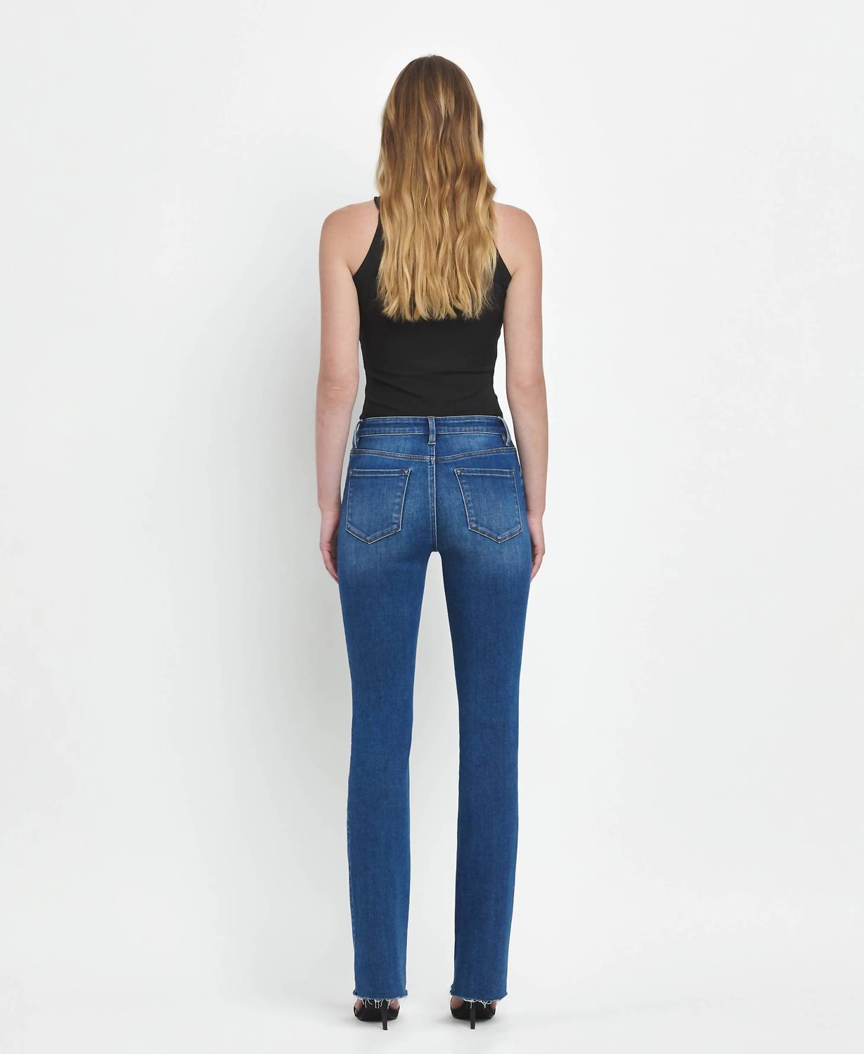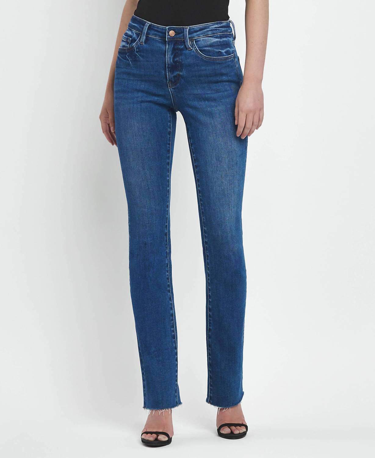 High-waist is here to stay and we especially love this style. Crafted from a comfortable cotton blend with 75% cotton, 23% polyester, and 2% spandex for an impeccable fit. These jeans feature a stylish bootcut leg with a 34" inseam, a 10" high-rise waist, and a modern clean-cut raw hem. Designed for versatility, this slim fit flatters any silhouette, and the button closure ensures a secure fit. Perfect for any occasion, these jeans come in a solid foreground color with functional pockets.