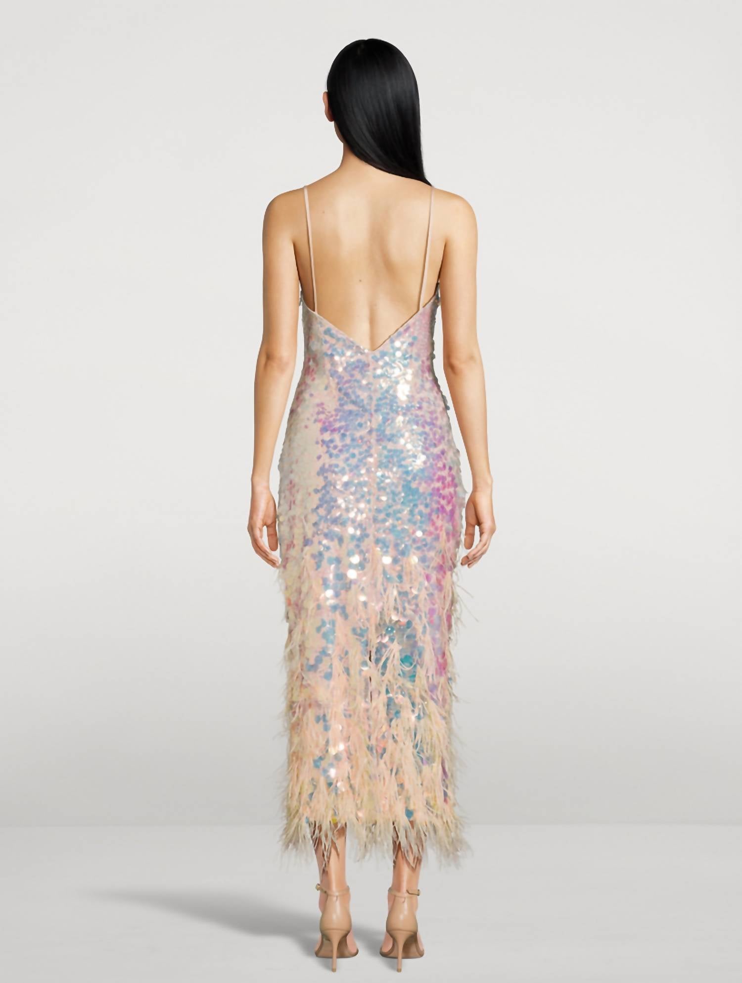 Just add slides or mules and you are good to go. Step into elegance with the Miriana Feather-Trimmed Sequin Slip Midi Dress by LoveShackFancy in Iridescent Peche. This sleeveless masterpiece, crafted from 100% polyester with a 94% polyester, 6% elastane lining and trimmed with ostrich feathers, features a flattering V-neck and spaghetti straps for a sleek slip silhouette. Designed for a statement-making dinner party look, it ensures a striking presence with its textured pattern and light-catching paillettes. Originating from an imported collection, the dress includes a discreet zip closure and requires dry cleaning for care.