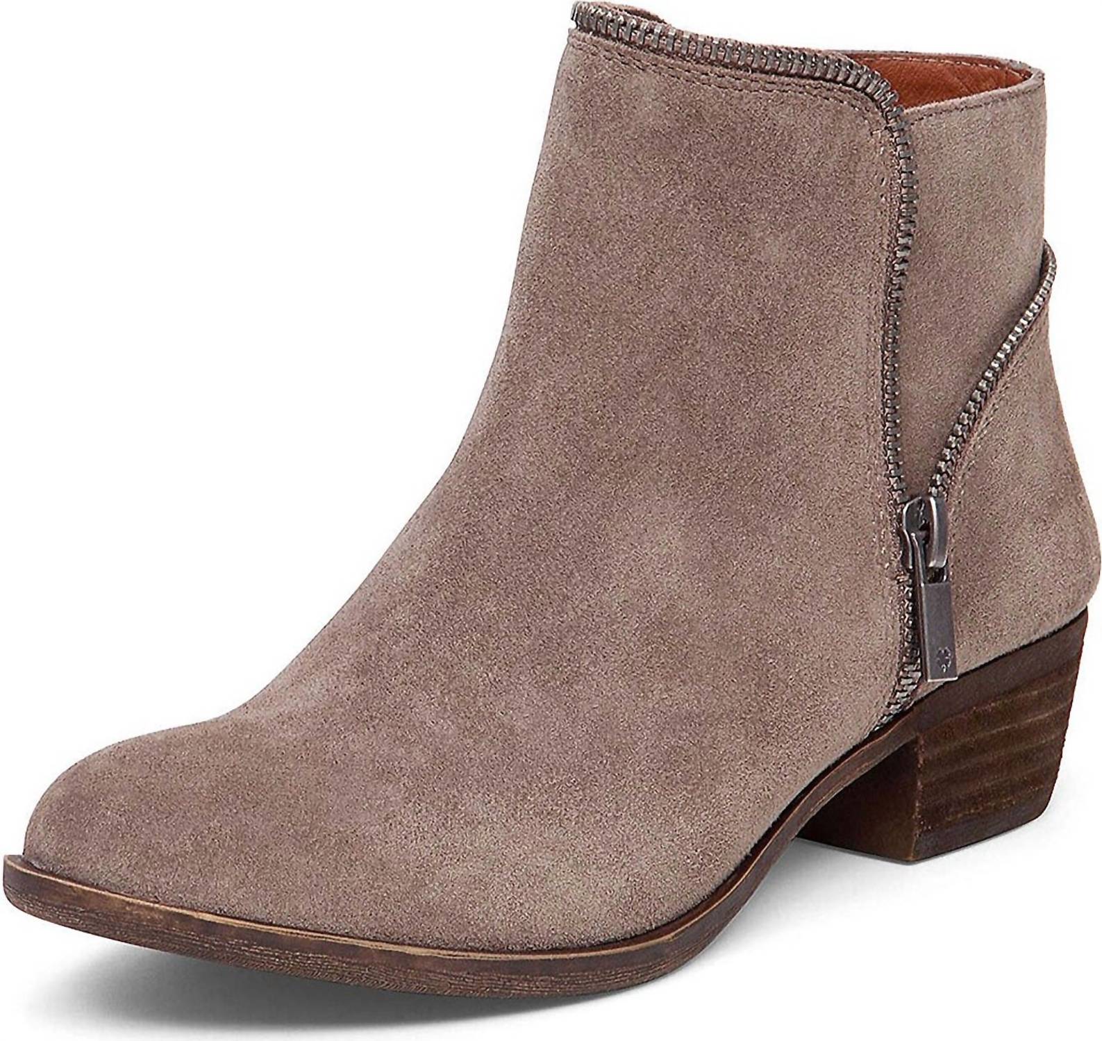 Say hello to the perfect, most versatile boot. The ankle height makes this style easily transition from day to night. Wear them with your favorite skinny jeans and tee for a more laid back look, or pair them with your favorite mini dress and jacket for a night out on the town. Introducing the Women's Boide Brindle Ankle Boots by Lucky Brand, a statement piece in taupe suede designed to elevate your style. Made in Brazil, these boots feature a leather upper and sole with dual zippers and a fashionable wrap-around zipper detail. The towering block heel stands at over 5 inches, adding height and confidence. Perfect for a dinner party, these boots fit true to size and showcase an almond toe shape for a minimalist, elegant look.