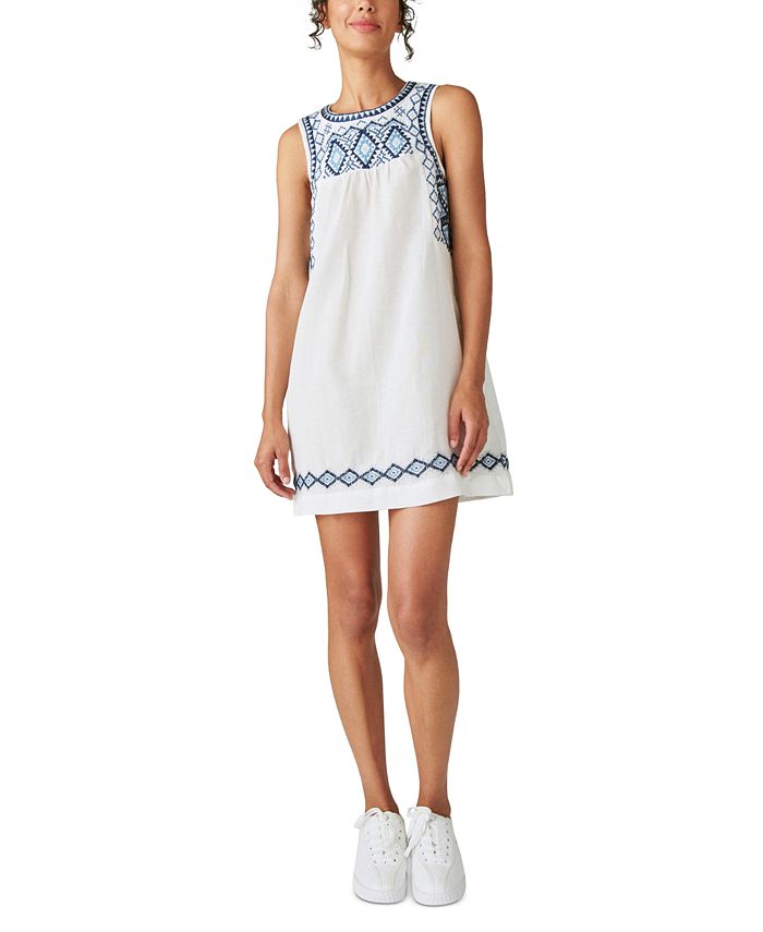 Gorgeous geometric embroidery trims this this breezy shift mini cut from a lightweight blend of cotton and linen| Crewneck Sleeveless Lined 65% cotton| 35% linen with 100% polyester embroidery Machine wash| tumble dry Imported