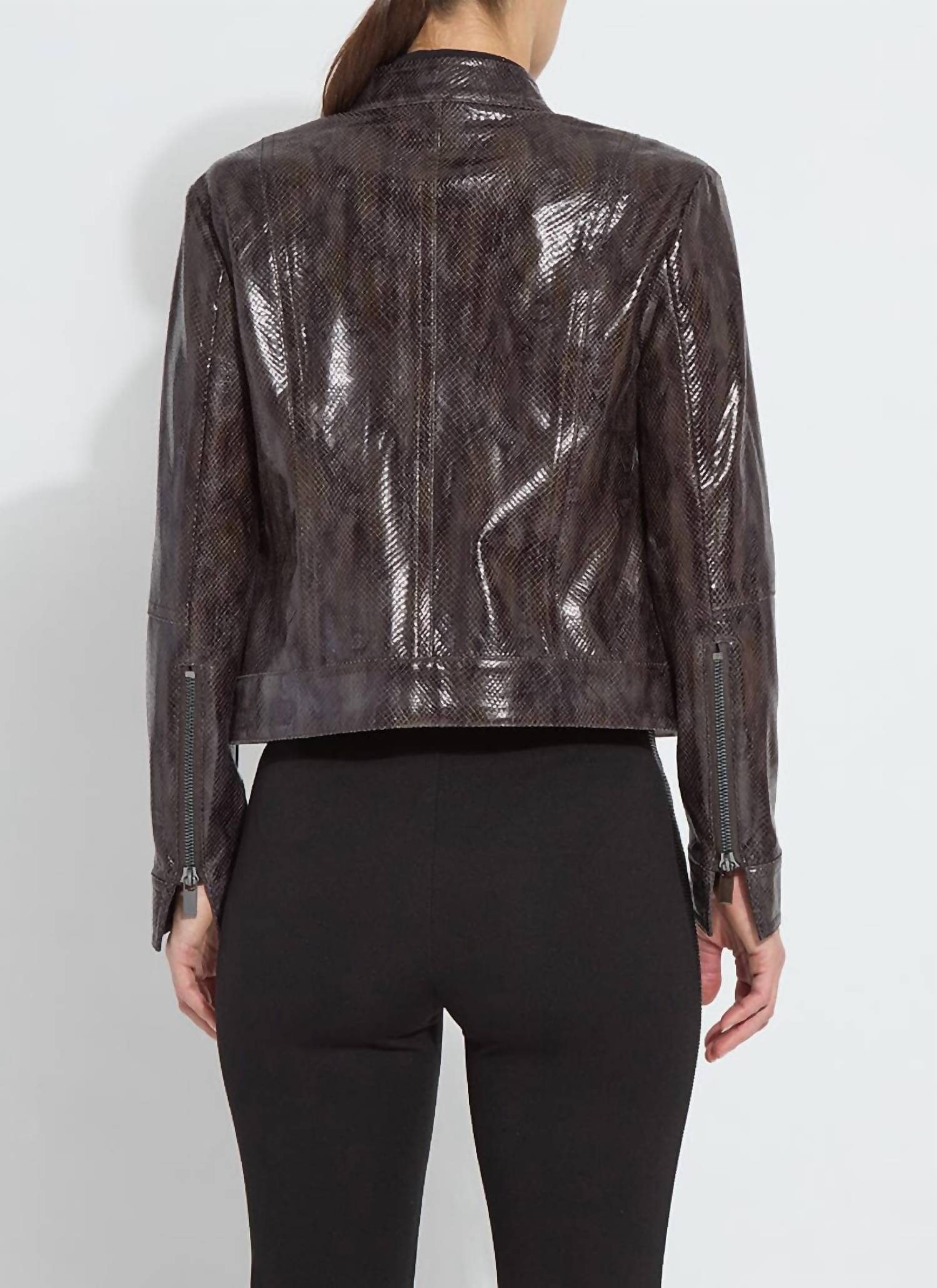 Soft leather, impeccable design. This leather jacket is a win-win. Elevate your outerwear collection with the Bennett Patent Vegan Leather Jacket by Lysse, featuring a standout Liquid Mocha Snake pattern. This versatile piece boasts long sleeves and is crafted from 90% Polyester and 10% Spandex for a comfortable, flexible fit. Designed with front patch pockets and chunky gunmetal zippers, it combines style with practicality. Closure: Snap closure. Care: Machine wash and line dry. Model is 5'10" and wears a size S.