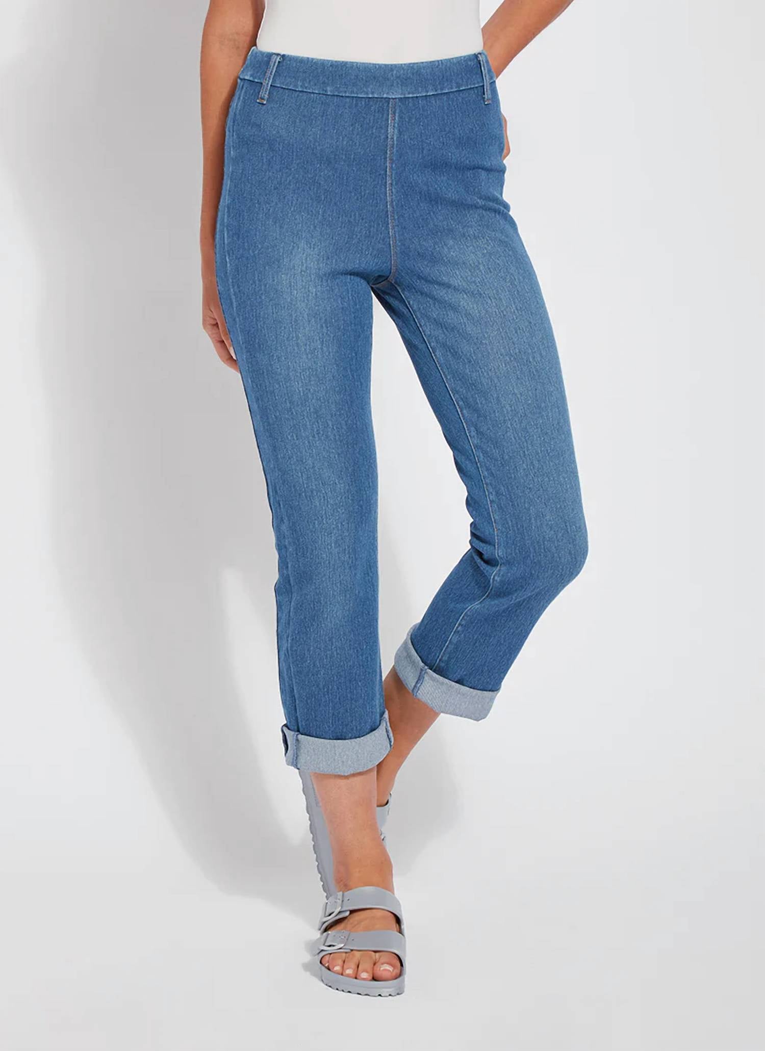 Upgrade your wardrobe with these cropped pants, designed to merge sophistication and wearability. The tailored fit ensures ultimate comfort during long days or nights out. Elevate your denim collection with the Can't Stop Crop Denim Pants by Lysse in a versatile Mid Wash. These women's high-rise boyfriend jeans feature a straight leg and are crafted from 4-way stretch Knit Denim, comprising 95% Cotton and 5% Elastane. Designed with a concealed patented 360 smoothing waistband, these jeans offer both comfort and style, complete with belt loops and back patch pockets. Enjoy a 24" inseam cuffed and a 28" inseam uncuffed, with a pull-on closure for easy wear. Care instructions include machine wash and line dry.