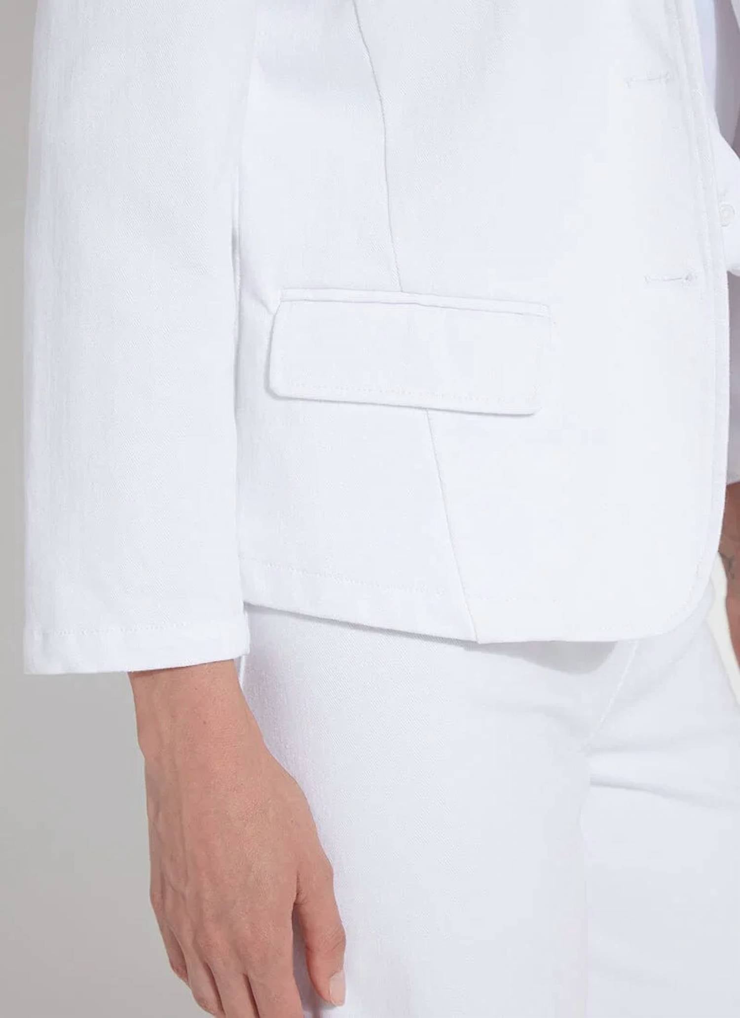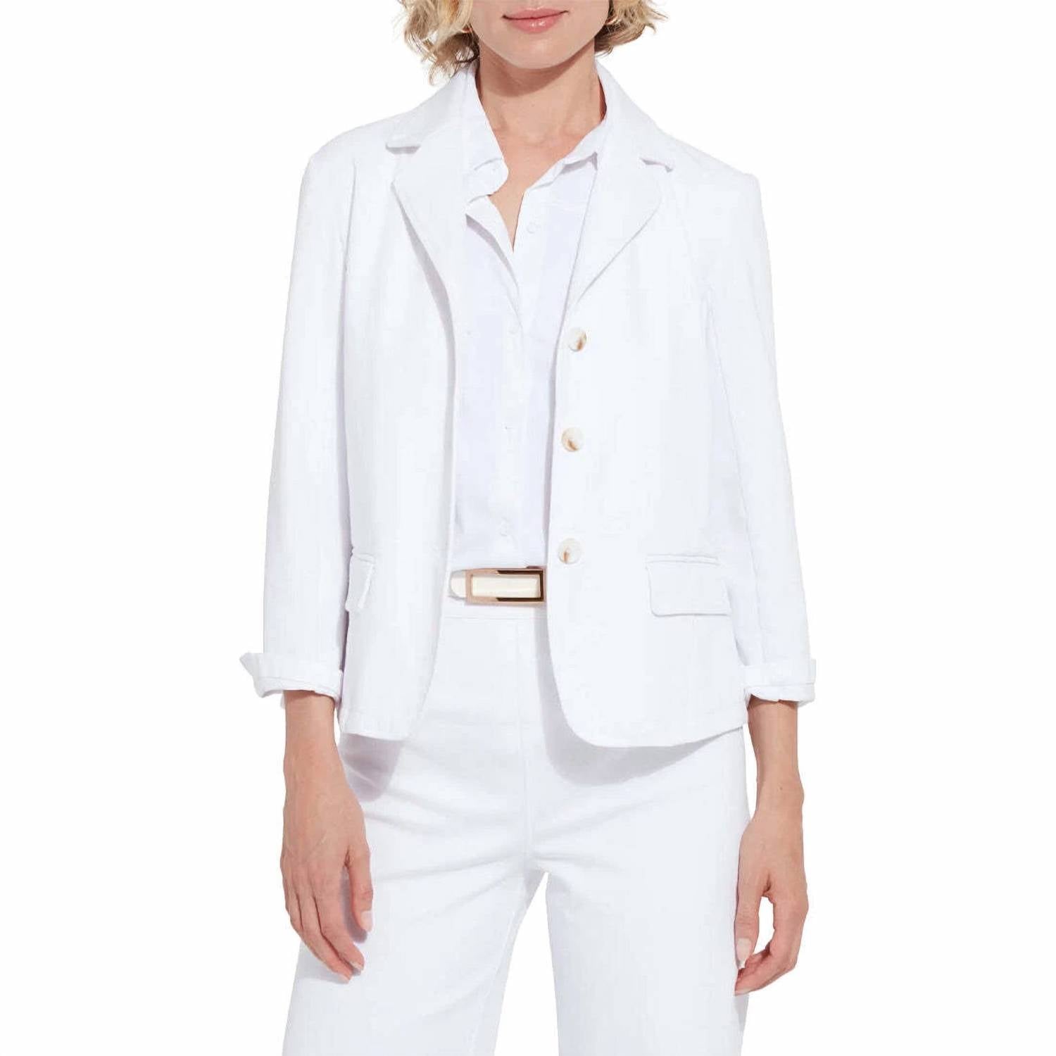 A blazer so versatile you can wear it to the office or pair it with jeans for a more casual look. Introducing the Della Denim Blazer by Lysse, a modern twist on a classic design featuring bracelet-length sleeves and a chic cropped fit. Crafted from a stretchy blend of 95% cotton and 5% elastane, this solid white blazer is both comfortable and stylish. Measuring 22 1/2" to 24" in length, it includes notched lapels, front flap pockets, and a front button closure. Care for this must-have piece is easy with machine wash and line dry instructions.