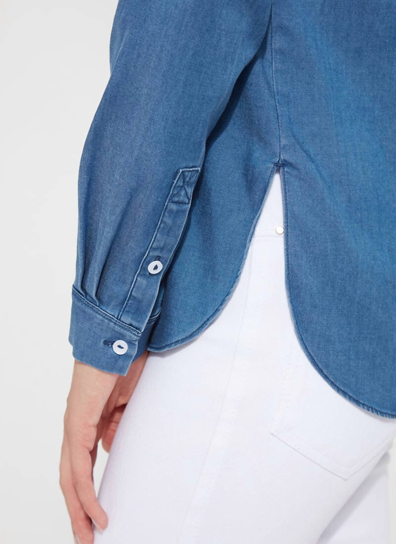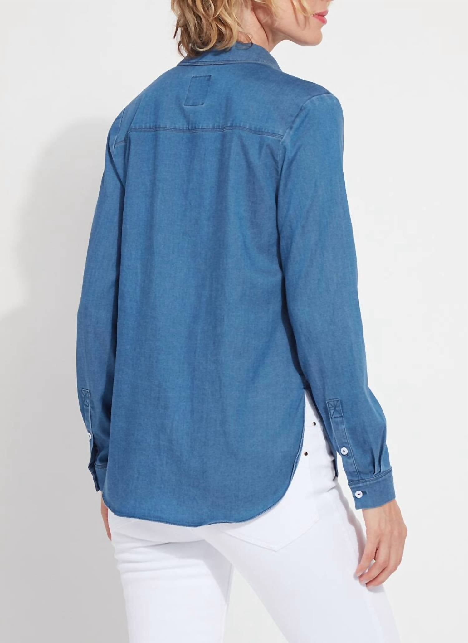 Perfectly tailored and soft to the touch. Discover the Drew Chambray Shirt by Lysse, a Mid Wash essential in every woman’s closet. This shirt features long sleeves with mini cuffs and is crafted from a blend of 63% Tencel, 25% Polyester, 11% Viscose, and 1% Spandex for ultimate comfort with 2-way stretch. It includes a practical front pocket, button closure, and is complete with a collar and rounded shirttail hem. Caring for your garment is easy with machine wash instructions and line dry recommendations. Model is 5’10” and wears a size S.