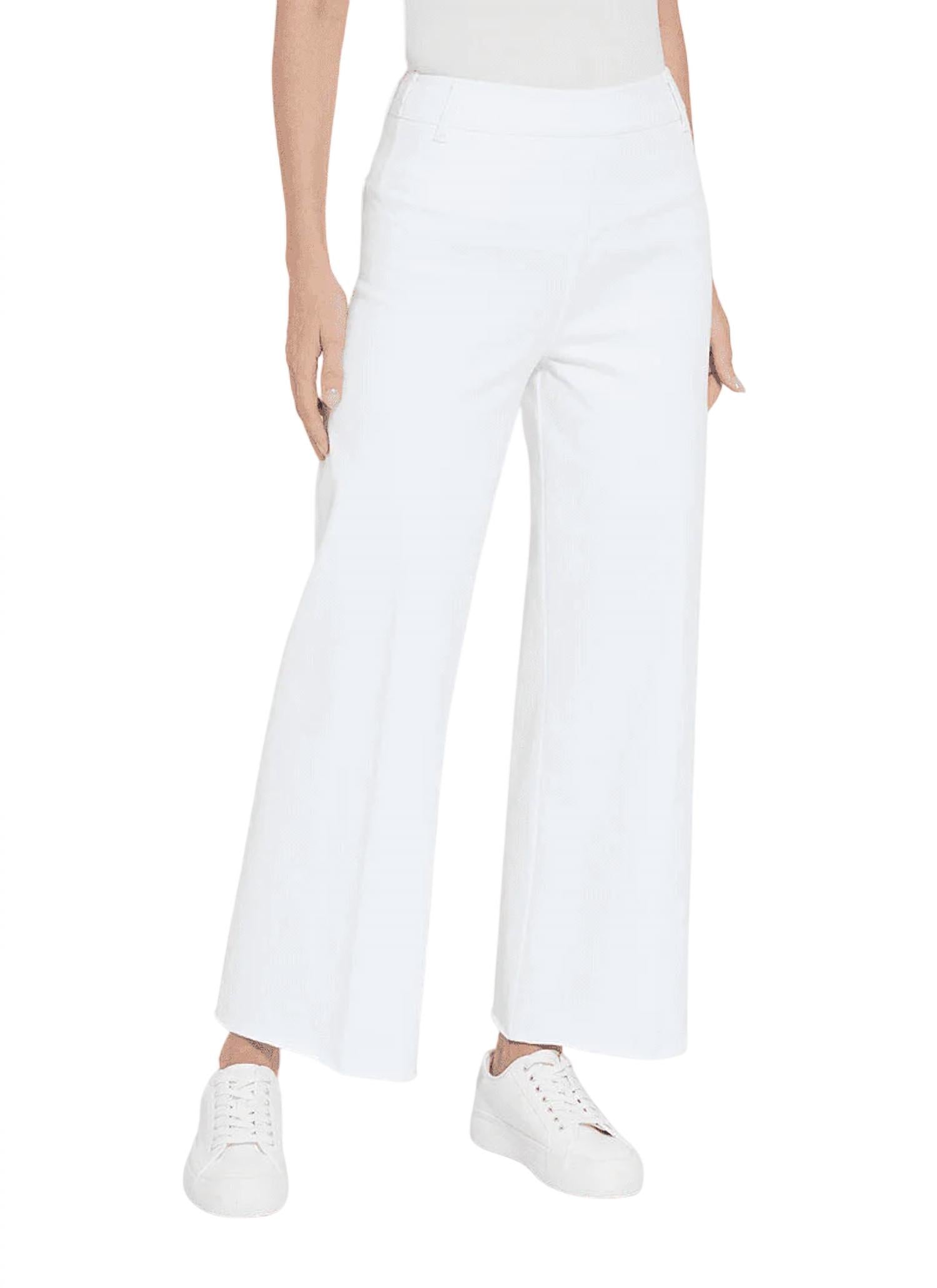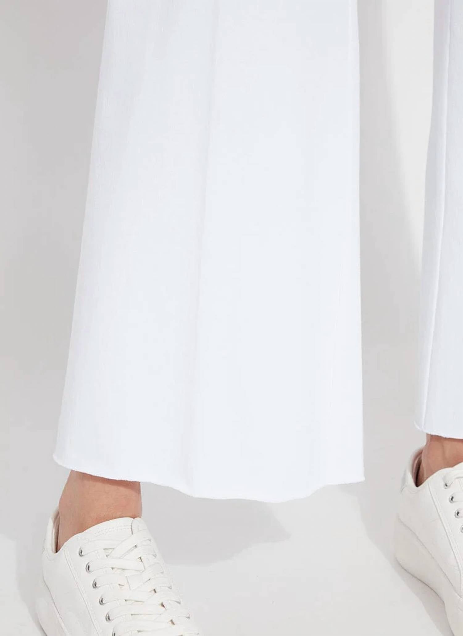 Elevate your wardrobe with the Erin High Waist Wide Leg Denim by Lysse in a crisp white hue, perfect for women who embrace style and comfort. Crafted from a 4-way stretch Knit Denim composed of 95% Cotton and 5% Spandex, these high-rise jeans feature a relaxed, extra-wide leg design without side seams, a concealed patented 360 smoothing waistband, and a raw-edge hem, making them easy to customize to your desired length. Complete with back patch pockets adorned with gunmetal studs, belt loops, and topstitching, these pull-on jeans are distinguished by a 28" inseam that skims the waist and thigh. For care, machine wash and line dry to maintain their sleek appearance. Model is 5’10”, wearing size S.