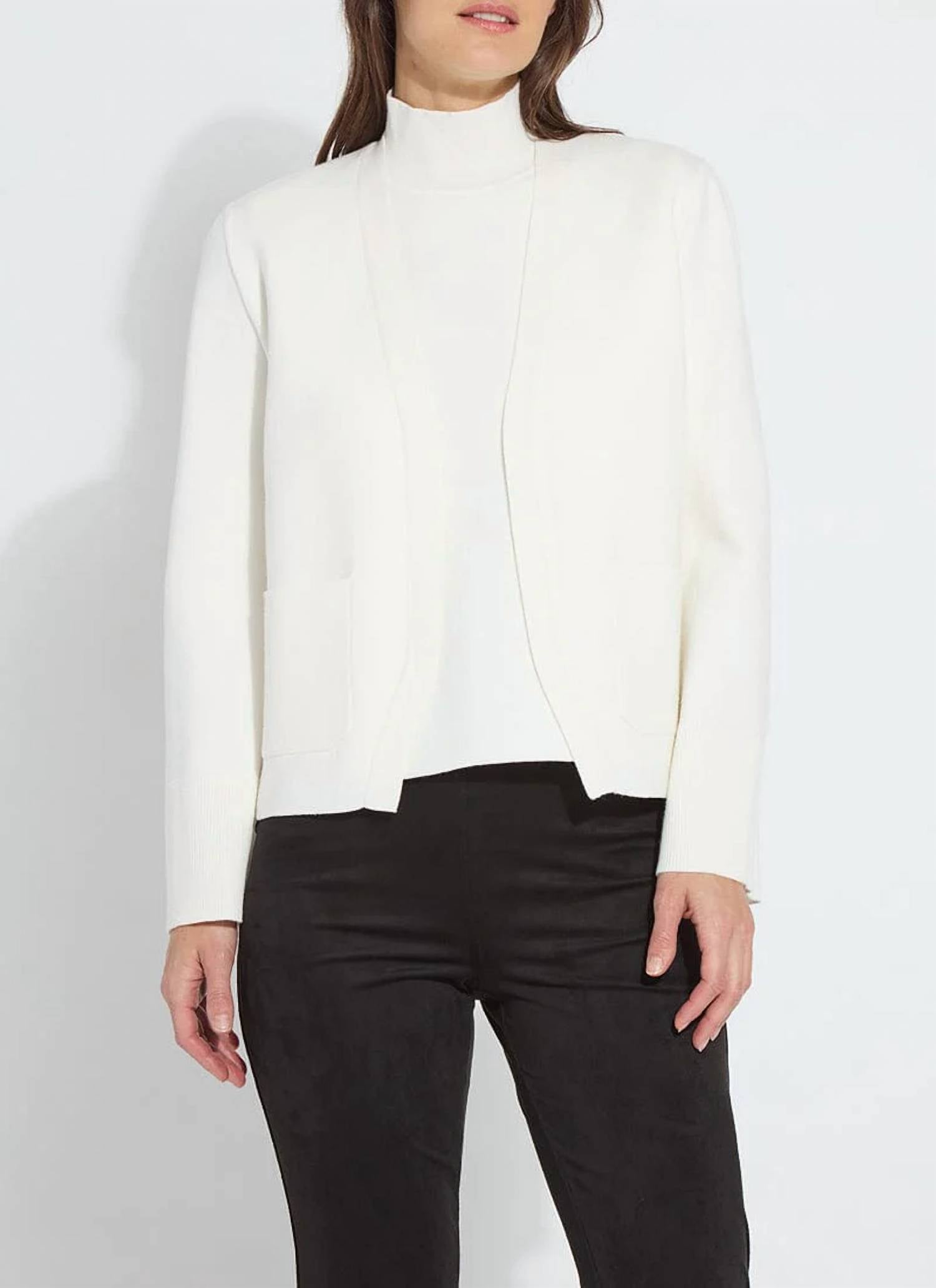This cardigan will be a sweater-rotation favorite. Indulge in the luxurious feel of the Gianna Knit Sweater Cardigan by Lysse, crafted in Snow White for chic elegance. This cardigan features long bell sleeves, an A-line cut, and convenient pockets, finished with a flattering cropped length. Made from double-face Cozy Jacquard Knit, it offers 4x-stretch and ensures a true-to-size fit. Closure: Pull on. Care: Machine wash, lay flat to dry. Model is 5’10" and is wearing a size S.