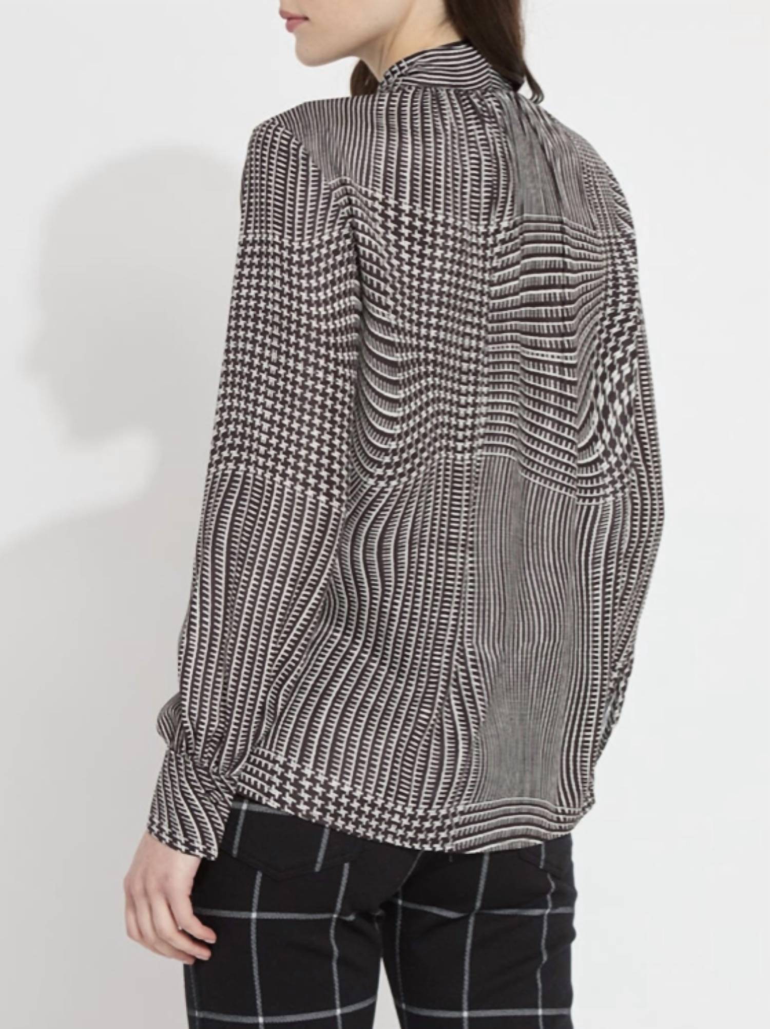 A versatile blouse that works from desk to dinner! Plaid pattern blouse—long sleeves-v neck with scarf tie-pull on-straight hem with side slits