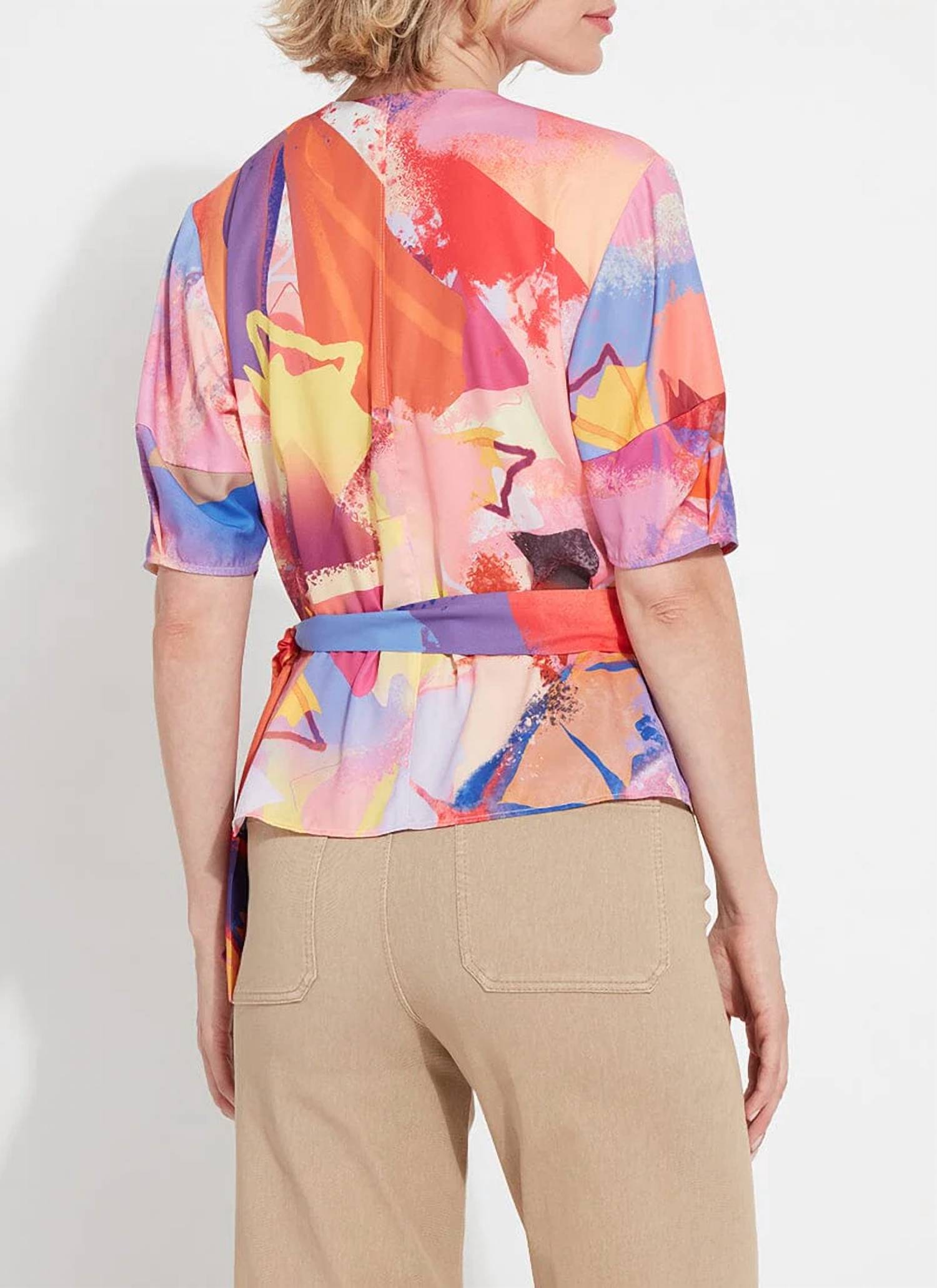 Pair this with your favorite jeans and slides for your next girls night out. The Juno Tie Wrap by Lysse is a striking addition to your wardrobe, crafted with a short sleeve design and V-neckline. Featuring a lightweight satin front and sleeves with a stretchy Jersey back, this top is perfect for adding a touch of elegance. Made from 100% polyester, it flaunts a Zesty Shades placed print and includes side ties for an adjustable fit. Closure is a tie closure, and it is easy to care for with machine wash and line dry instructions. Model is 5'10" and is wearing a size S.