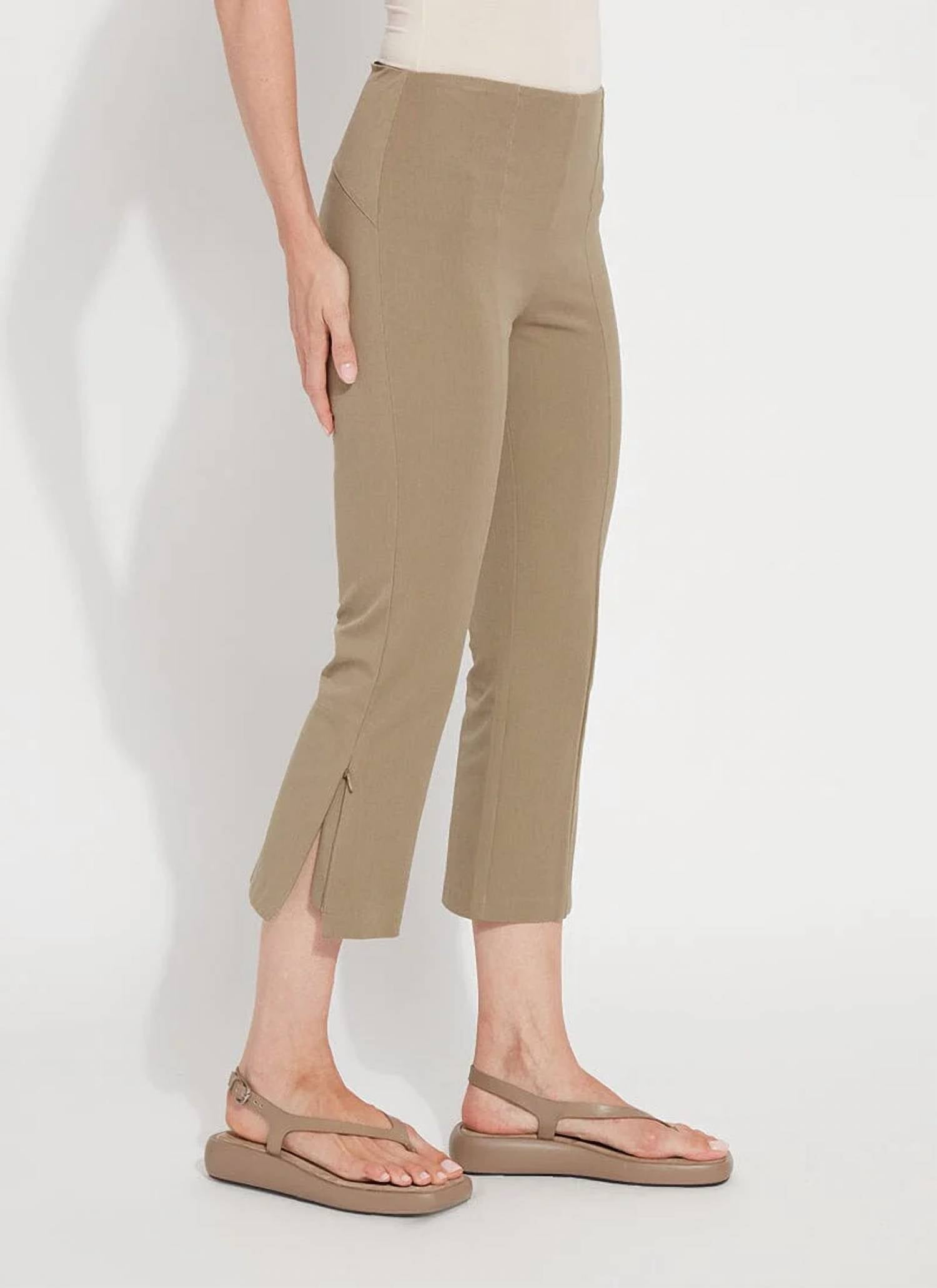 Stay on-trend and showcase your impeccable taste with these adaptable and stylish cropped pants. The perfect length to wear with your favorite mules. You'll love the fit! The Leighton Flare Crop Pant by Lysse in Olive Leaf is crafted from a 4-way stretch twill blending 52% cotton, 42% viscose, and 6% spandex. These ankle-length pants feature a high-rise waist with a concealed patented 360 smoothing waistband, delivering a fitted silhouette through the waist, hips, and thighs before flaring into cropped legs. The flared leg design is enhanced by zippered side hem slits, allowing for versatile wear. Closure: Pull on. Care: Machine wash, line dry. The model is 5’10” with a 24" inseam, showcasing a sleek, solid pattern ideal for a polished look.
