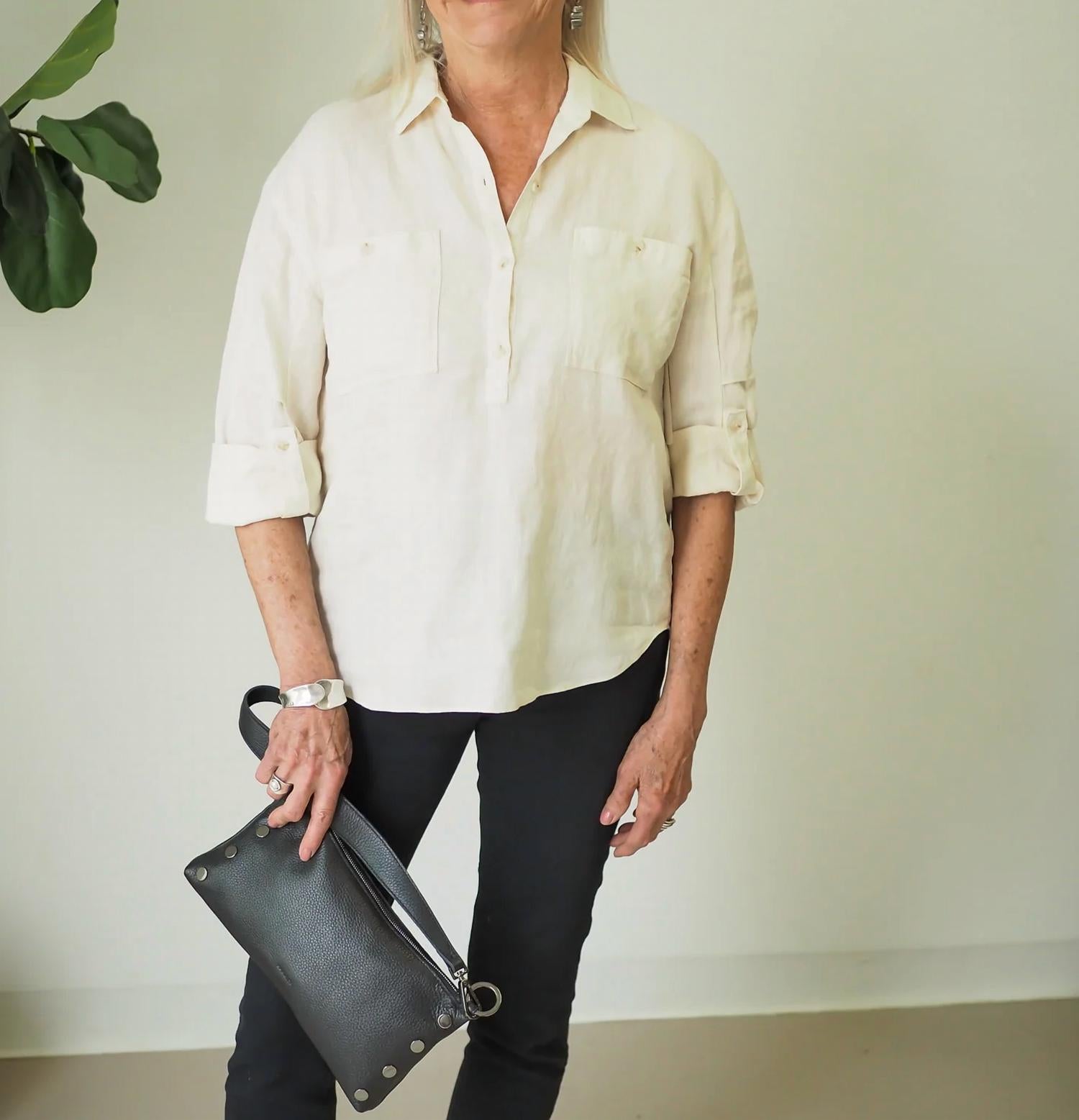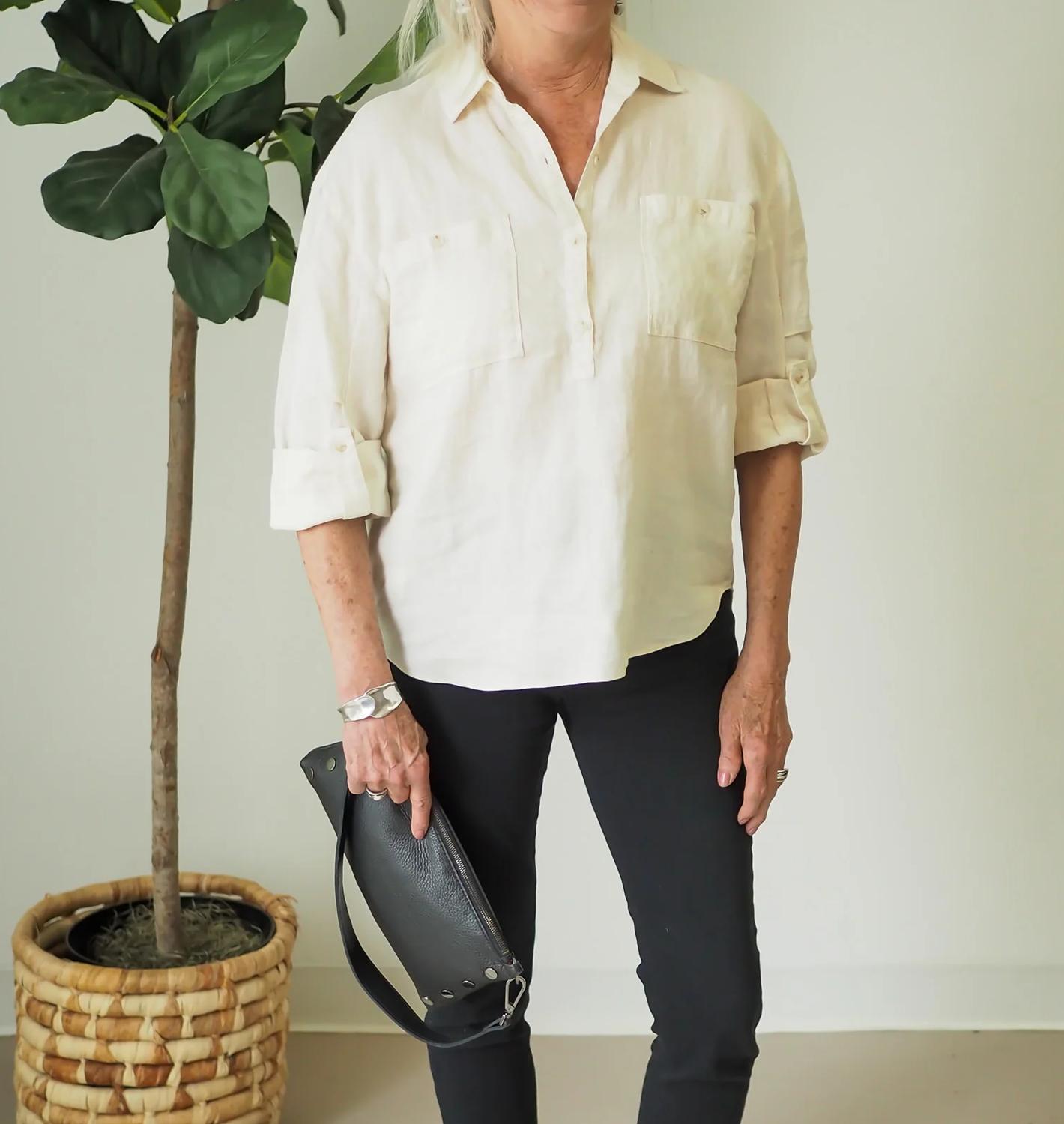 A versatile blouse that works from desk to dinner! The Lysse Rose Utility Three Quarter Sleeve Shirt in Ecru combines functionality with style, featuring a collared neckline and convenient roll tab sleeves. Crafted from 100% Linen, this solid blouse includes handy pockets for added utility. Closure: Half button closure. Care: Machine wash cold, line dry.