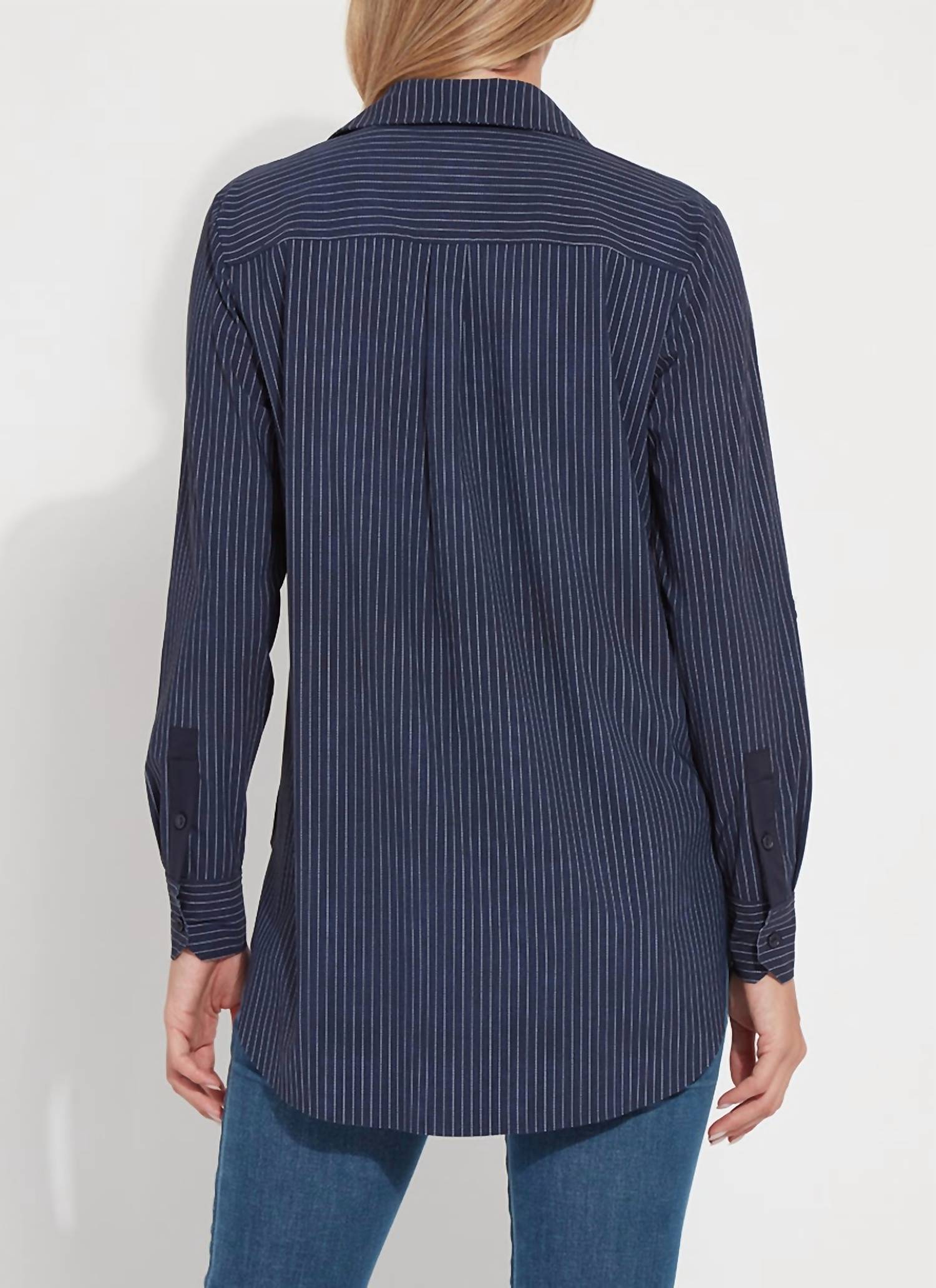 Perfectly tailored and soft to the touch. Introducing the Schiffer Button Down Shirt by Lysse, a stylish choice for workwear in an elegant Ultimate Pinstripe pattern. This long sleeve top is crafted from a 4-way stretch Microfiber, composed of 75% Nylon and 25% Spandex, and is tailored for a comfortable fit with a rounded raw-cut hem. Closure: Button closure. Care Instructions: Machine wash and tumble dry. Model is 5'10" and wears a size small.