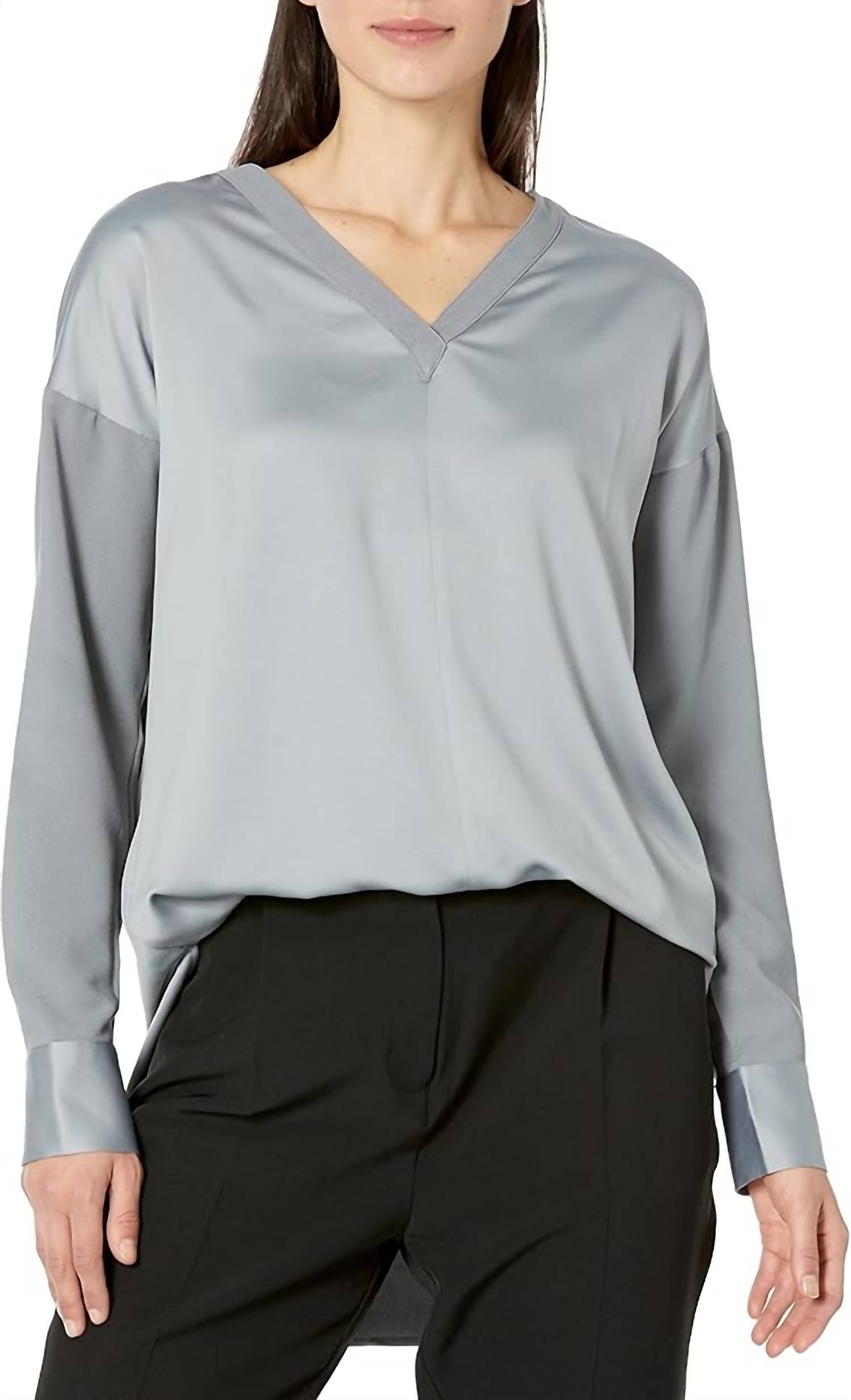 Pair this with your favorite jeans and slides for your next girls night out. Introducing the Token Pullover Top by Lysse in a sophisticated Blue Fog hue, perfect for women seeking style and comfort. This oversized blouse features long sleeves and a unique combination of shiny and matte satin, offering an elegant look with a cross-front V-neck and a high-low hem. Crafted from 100% Polyester satin, it includes a pull-on closure for effortless wear. Care instructions recommend machine washing for easy maintenance.