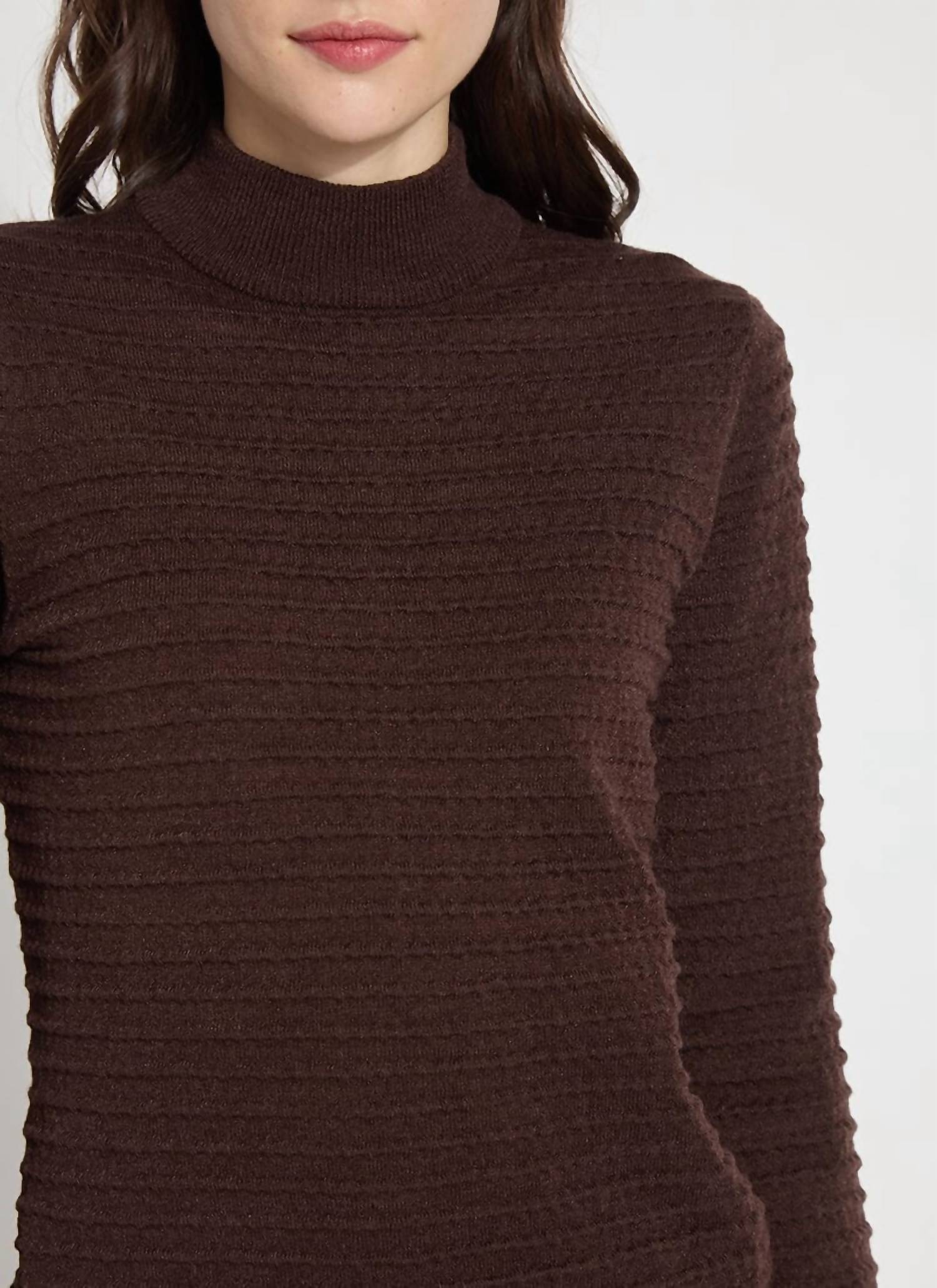 Stay warm and stylish in this versatile and effortlessly cool knitwear staple. Wear it alone or layered, it's the perfect sweater for the season and you'll wish you had it in every color. Introducing the Valery Smocked Mock Sweater by Lysse, a chic addition to your fall wardrobe in an elegant mocha hue. This women’s long sleeve sweater boasts a textured pattern with a fitted silhouette, making it perfect for layering under jackets. Crafted from 100% polyester, it features a 3-dimensional look with horizontal lines and offers 4-way stretch for added comfort. Closure: Pull-on design. Care: Machine wash and line dry. Model is 5'10" and wearing a size small.