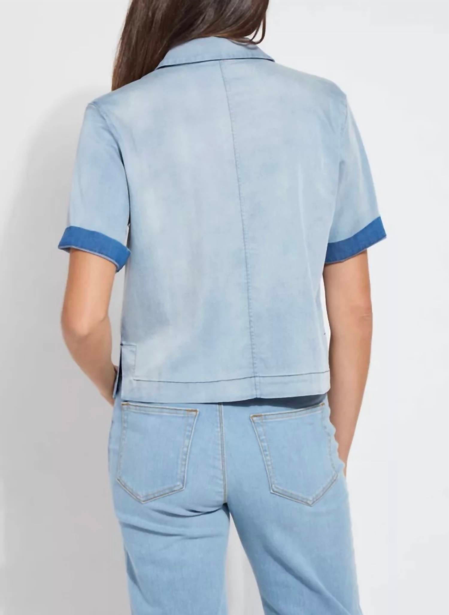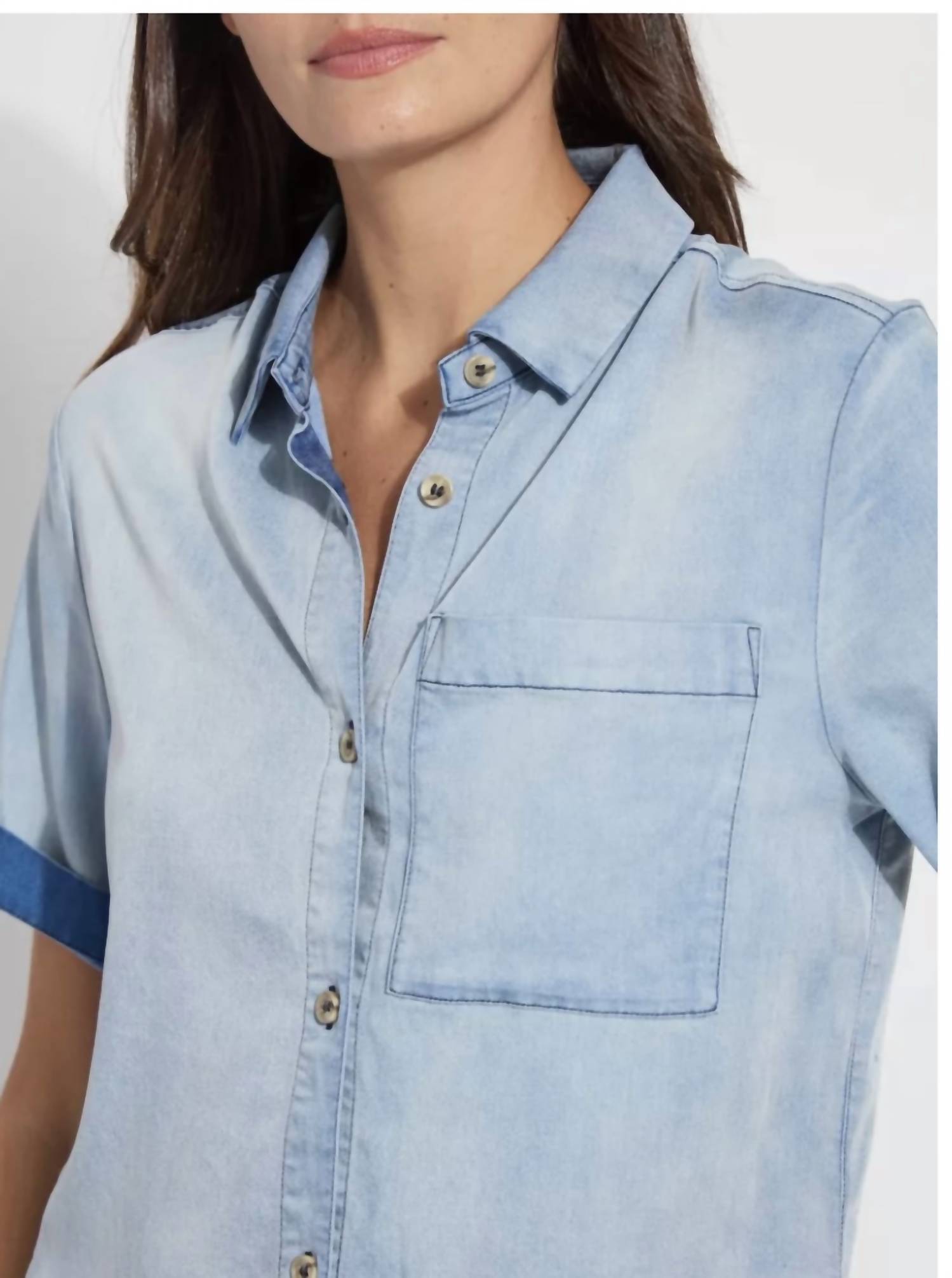 Introducing the Women's Bianca Chambray Top by Lysse, a must-have for your casual wardrobe. This streetwear-inspired piece features short sleeves and a stylish collar, ideal for summer vacations. Crafted from a blend of 63% Lyocell, 25% Polyester, 11% Viscose, and 1% Elastane, it delivers comfort with a modern slim fit and a button closure. Added functionality comes from the front pocket, making it both chic and practical.
