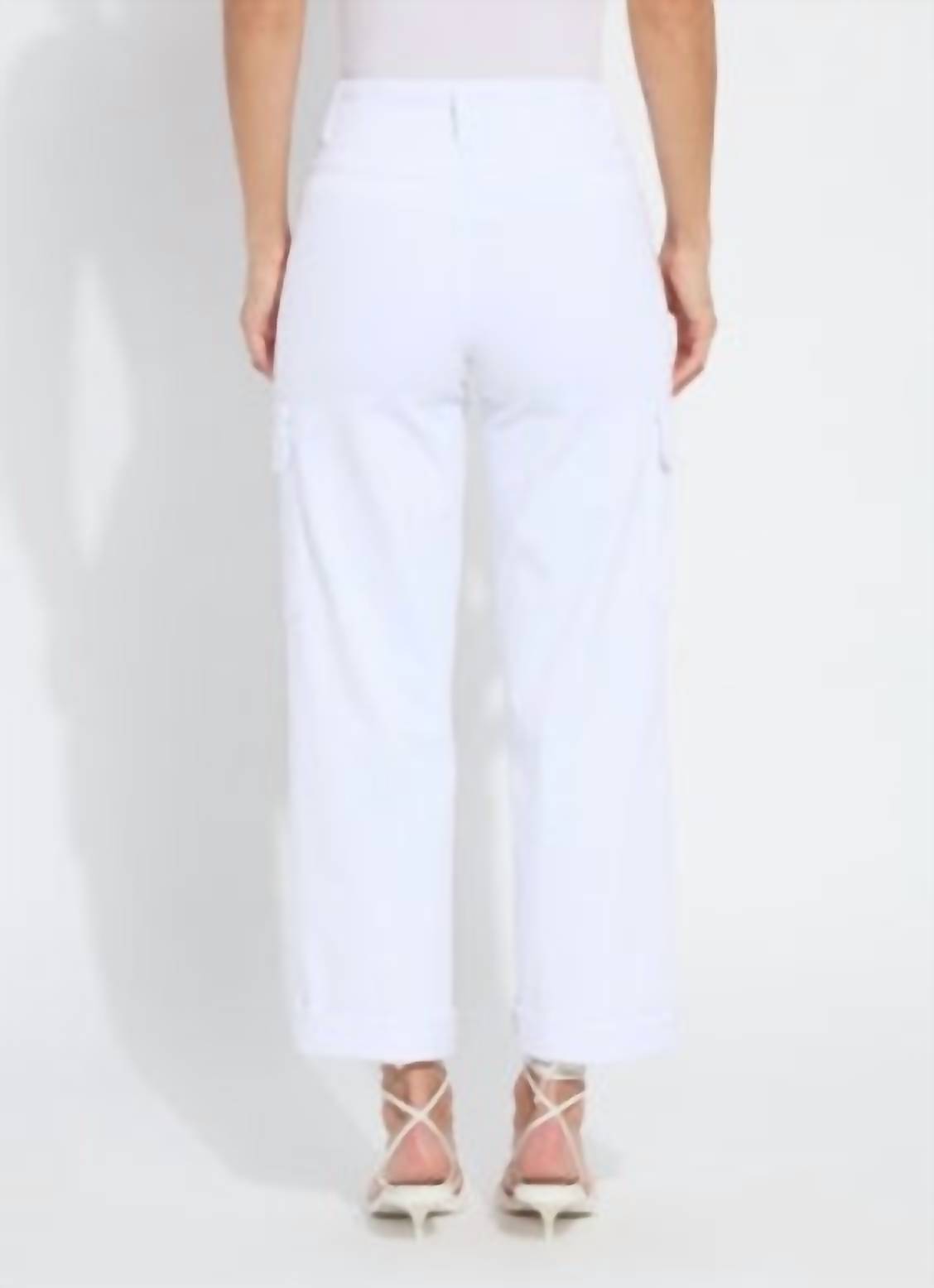 The Women's Scout Cuffed Cargo Pant by Lysse is a summer-ready staple in a minimalist white hue. These versatile pants feature classic cargo styling with patch and side pockets, complemented by a high waist and wide leg fit. Crafted from 95% cotton and 5% spandex Knit Denim, they offer a 4-way stretch with a concealed patented 360° smoothing waistband and a zip closure. With the option to wear them cuffed with a 27.5" inseam or uncuffed at 31", these pants are perfect for your vacation wardrobe.