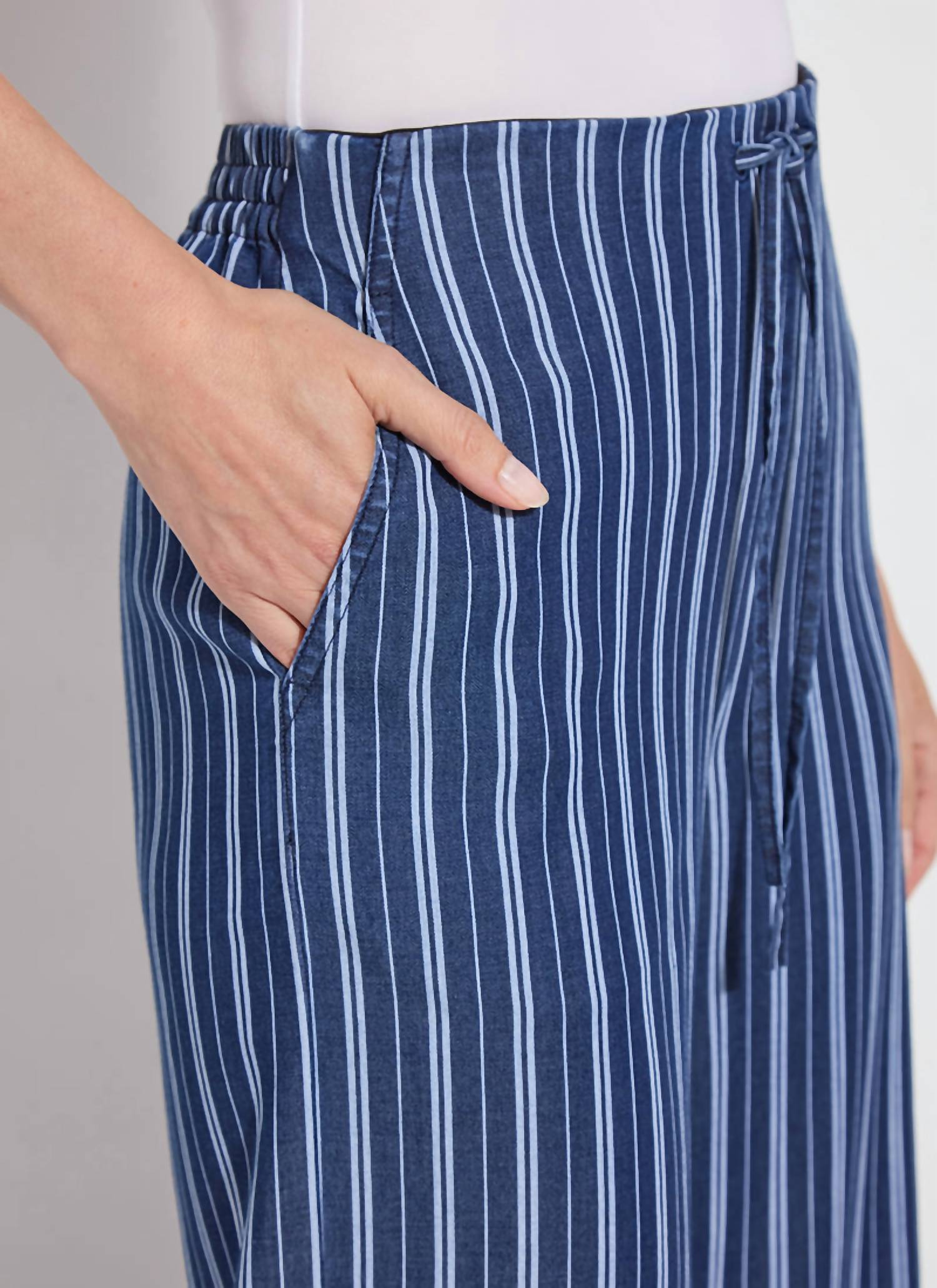 Experience effortless style with the Women's Serefina Wide Leg Trouser by Lysse, perfect for vacation wardrobes. These Vacay Chambray Stripe trousers boast a relaxed fit and wide leg style, offering a chic streetwear look. Crafted from a luxurious Viscose blend, featuring 64% Tencel, 31% Polyester, 3% Viscose, and 2% Spandex, they incorporate a functional zip closure and elasticated back waist for ultimate comfort. Enhanced with a self-tie front and functional side pockets, these pants bring both fashion and function to your summer ensemble.