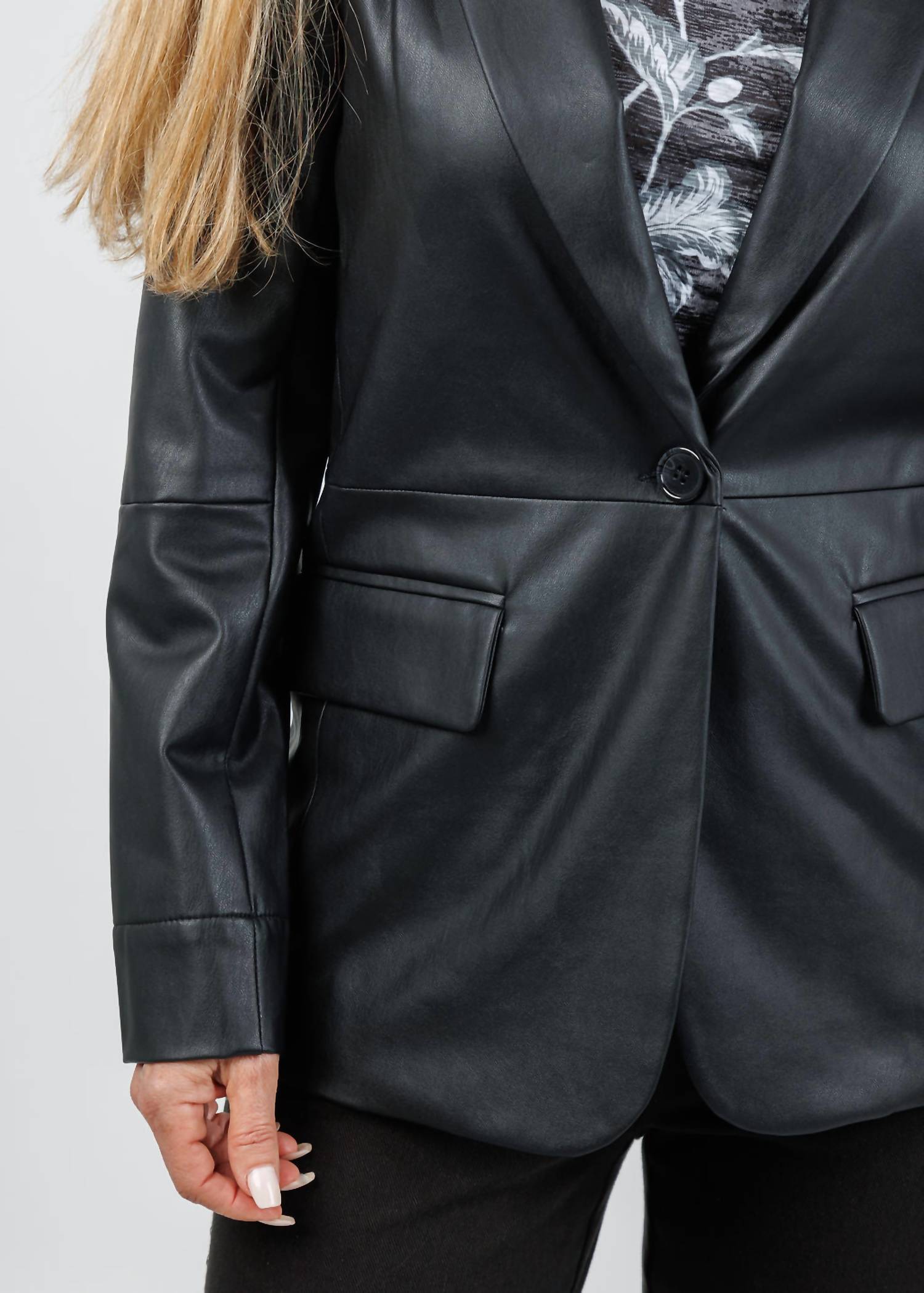 A leather jacket so good, it works with just about any outfit. The Lysse Women's Versatile Vegan Leather Blazer in sleek black is a timeless addition for the modern wardrobe. It features long sleeves with wrist slits and a single front button closure, crafted from lightweight 100% Polyurethane vegan leather boasting a 4-way stretch for an optimal slim fit. The blazer's half-satin lining and seams at the waist and sleeves mimic authentic leather craftsmanship, enhancing its chic appeal. Model Karen, standing 5'6" with a 34" bust, wears size XS, ensuring a fit that complements your silhouette beautifully.
