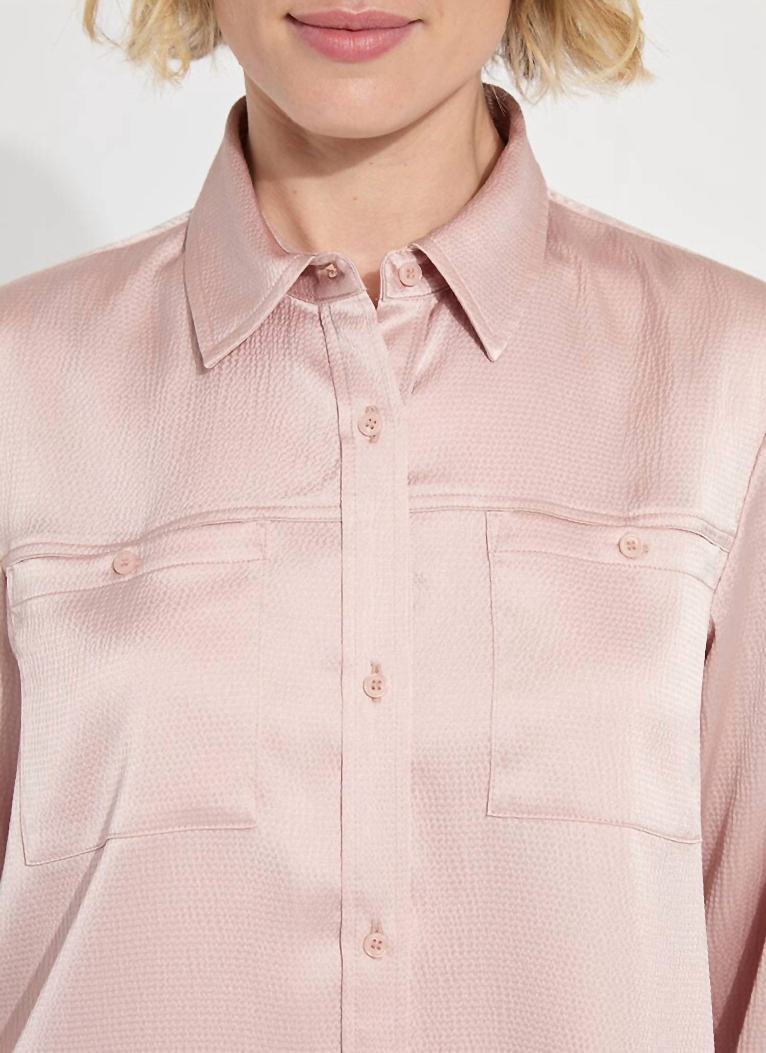 A versatile blouse that works from desk to dinner! Experience the elegance of the Zoe Utility Boho Blouse by Lysse in a captivating Antique Rose, perfect for the modern woman. Crafted from 98% Polyester and 2% Spandex, this blouse features long sleeves, a collar neckline, and a distinctive textured pattern. Thoughtfully designed with front patch pockets and a versatile button closure, it combines functionality and style for an oversized, easy-to-tuck look. Care instructions include machine washing and line drying to maintain its exquisite softness and stretch. Model is 5'10" and wears a size S for an ideal oversized fit.