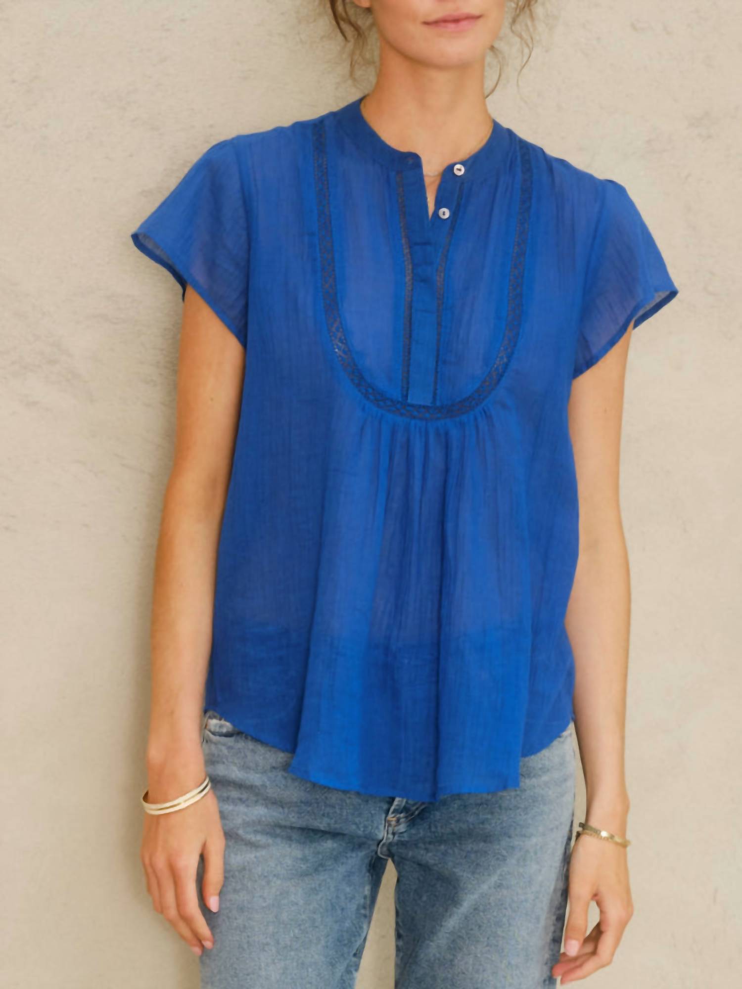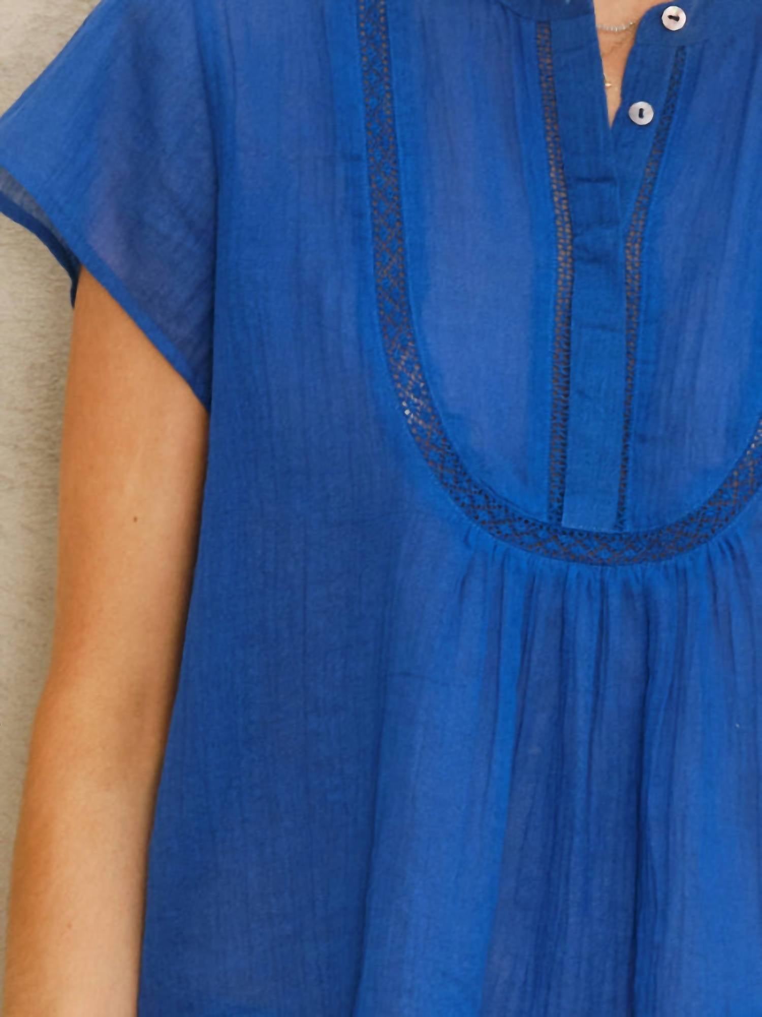 Pair this with your favorite jeans and slides for your next girls night out. Meet the Freya Lace Top by M.A.B.E., a Boho Chic staple in White Lace that offers a versatile addition to your summer wardrobe. This blouse is crafted from lightweight cotton, featuring short sleeves with a lace panel yoke, and a mockneck design. The silhouette is enhanced by a delicate curved dipped hem and gathers on the body, finished with a button closure. Perfect for layering or wearing solo, its elegantly textured fabric makes it suitable for occasions like church or Thanksgiving.