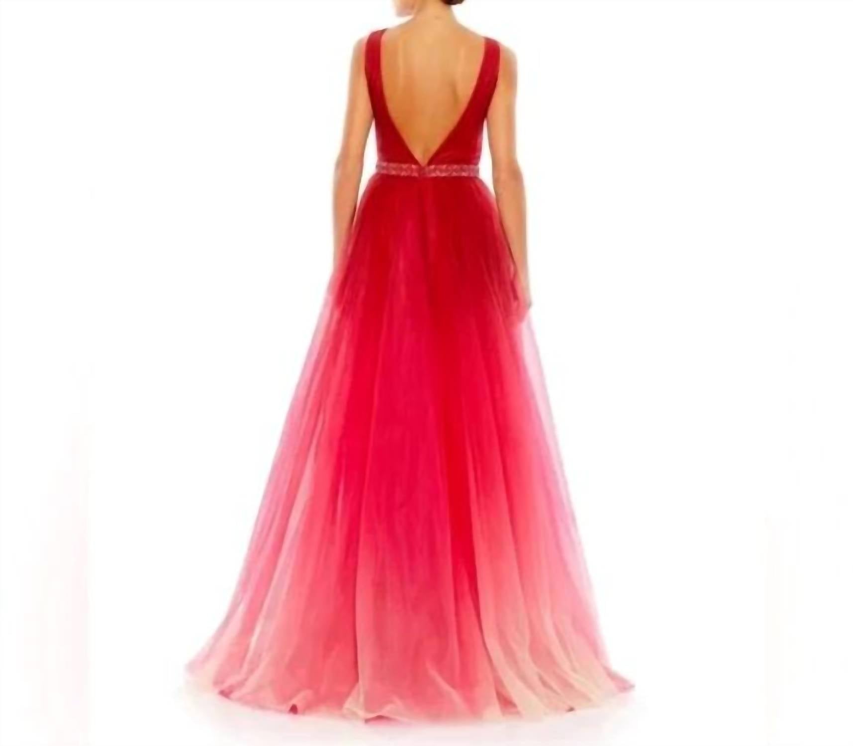 A maxi dress that is just as cute as it is comfortable. Step into elegance with the Beaded Belt Wrap Over Sleeveless Ballgown by Mac Duggal, perfect for making a statement at any evening event. This stunning red ombre gown is crafted with a tulle overlay and a 100% polyester lining, ensuring both comfort and allure. Featuring a structured pleated bodice and a hand-beaded waist detail, this fit-and-flare silhouette is sleeveless with a V-neckline, highlighted by a captivating V-shaped open back. Approximately 62.5 inches from the top of the shoulder to the bottom hem, it is finished with a concealed zip closure and requires dry cleaning for care.