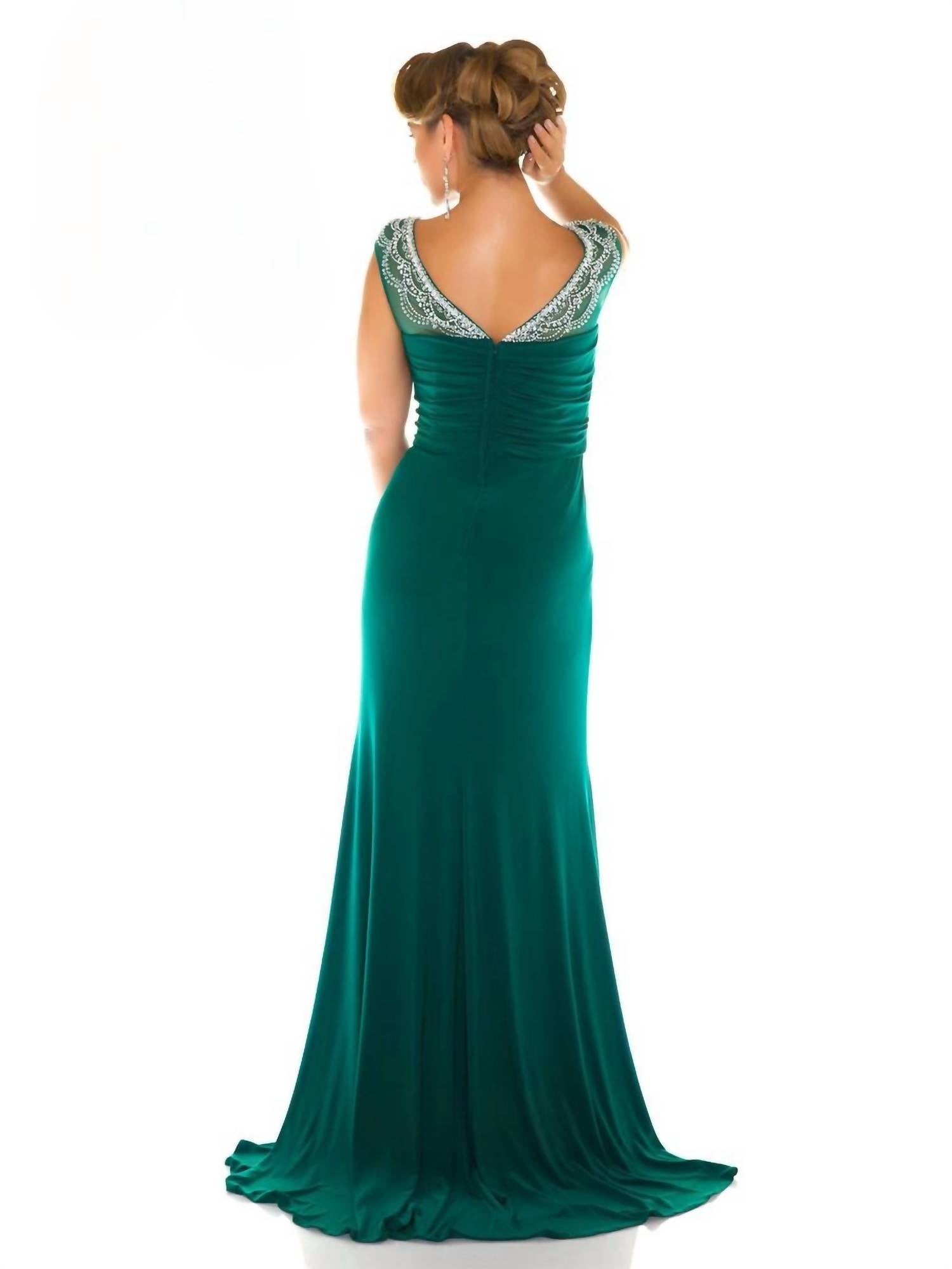 Looking for that perfect event dress? Look no further... Introducing the Illusion Neck Beaded Gown by MAC DUGGAL, a stunning choice for any formal occasion in deep emerald. This sheath silhouette gown features elegant cap sleeves and a sophisticated boatneck. The dress is beautifully detailed with intricate patterns and secures with a convenient zip closure. A luxurious statement piece designed specifically for plus-size women.