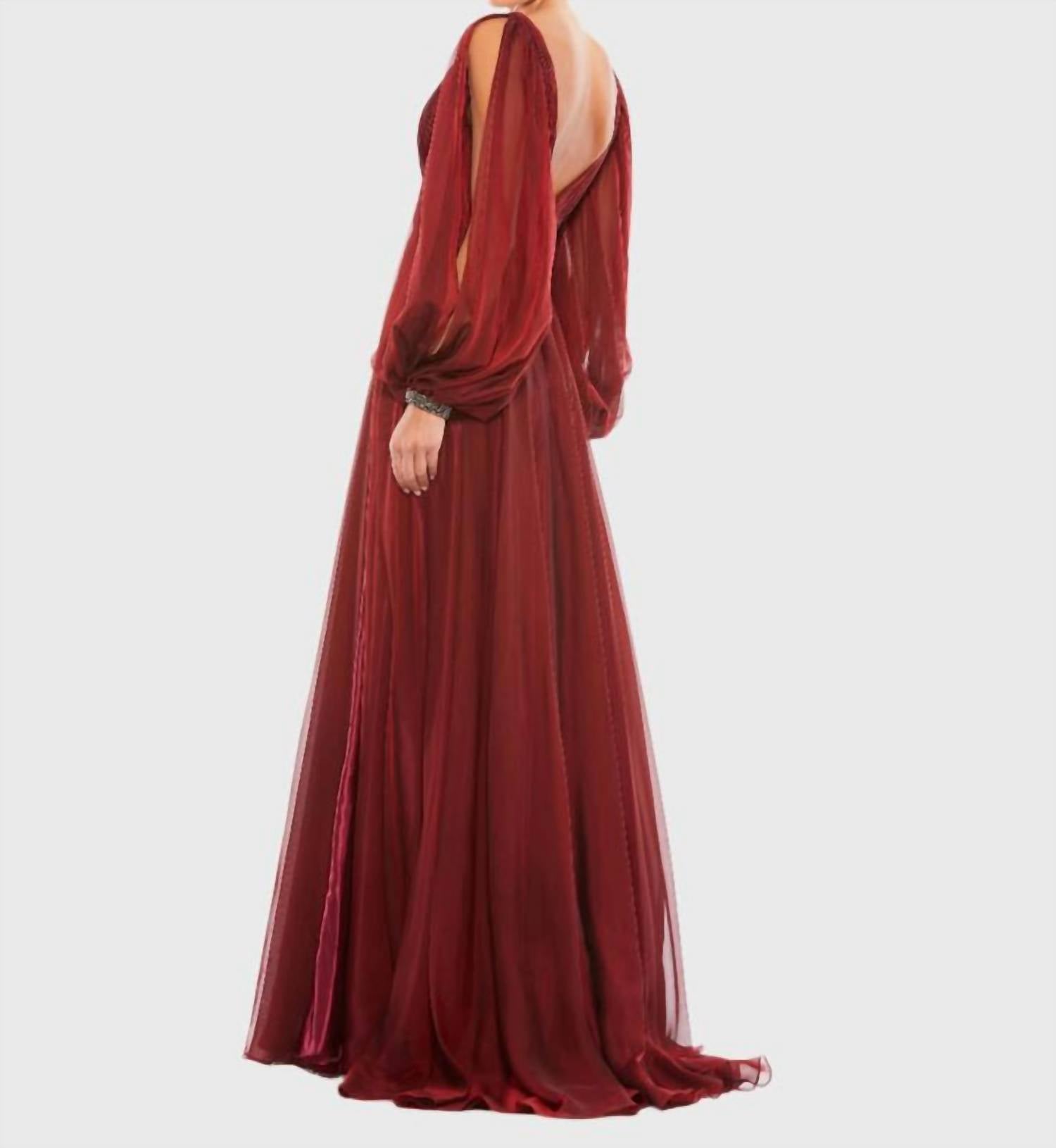 A maxi dress that is just as cute as it is comfortable. Introducing the Mac Duggal V-neck A-line Chiffon Gown, where elegance meets sophistication in a stunning garnet hue. This romantic maxi dress features long, whimsical bell sleeves with intricate beaded cuffs, complemented by a flattering ruched bodice. Crafted from 100% polyester chiffon, the gown measures approximately 60 inches in length and boasts a convenient back zip closure. Perfect for evening events, this gown allows you to embrace minimalist trends effortlessly.