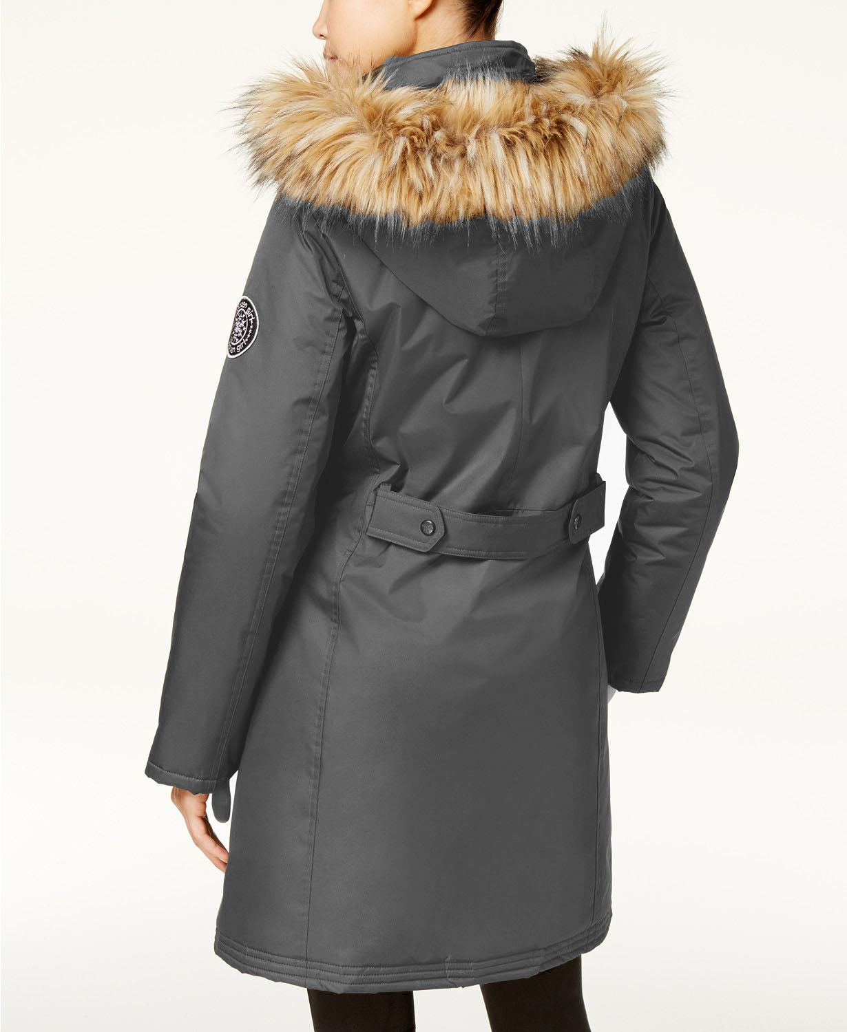 Mid-weight | Snap-tab belt at back waist | Stand collar; removable hood with faux-Faux trim | Water resistant | Zipper and flap pockets at hip; snap slit pockets at chest | Zipper closure at front |