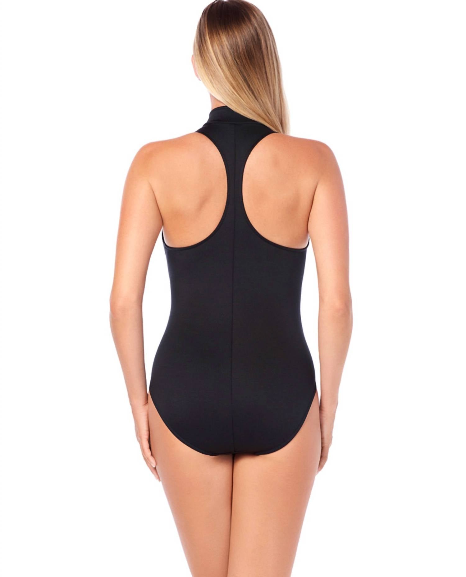 A one piece so chic you could even wear it as a bodysuit with your favorite pair of jeans.This Swimsuit features a High neckline. Visually slim torso with princess seams and zip front bodice. Racerback. Underwire bra. 69% Nylon, 31% Lycra Spandex.