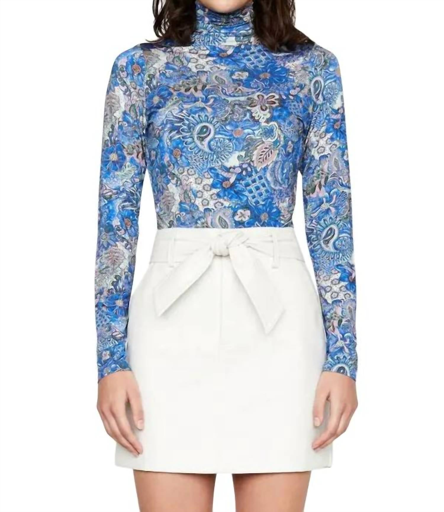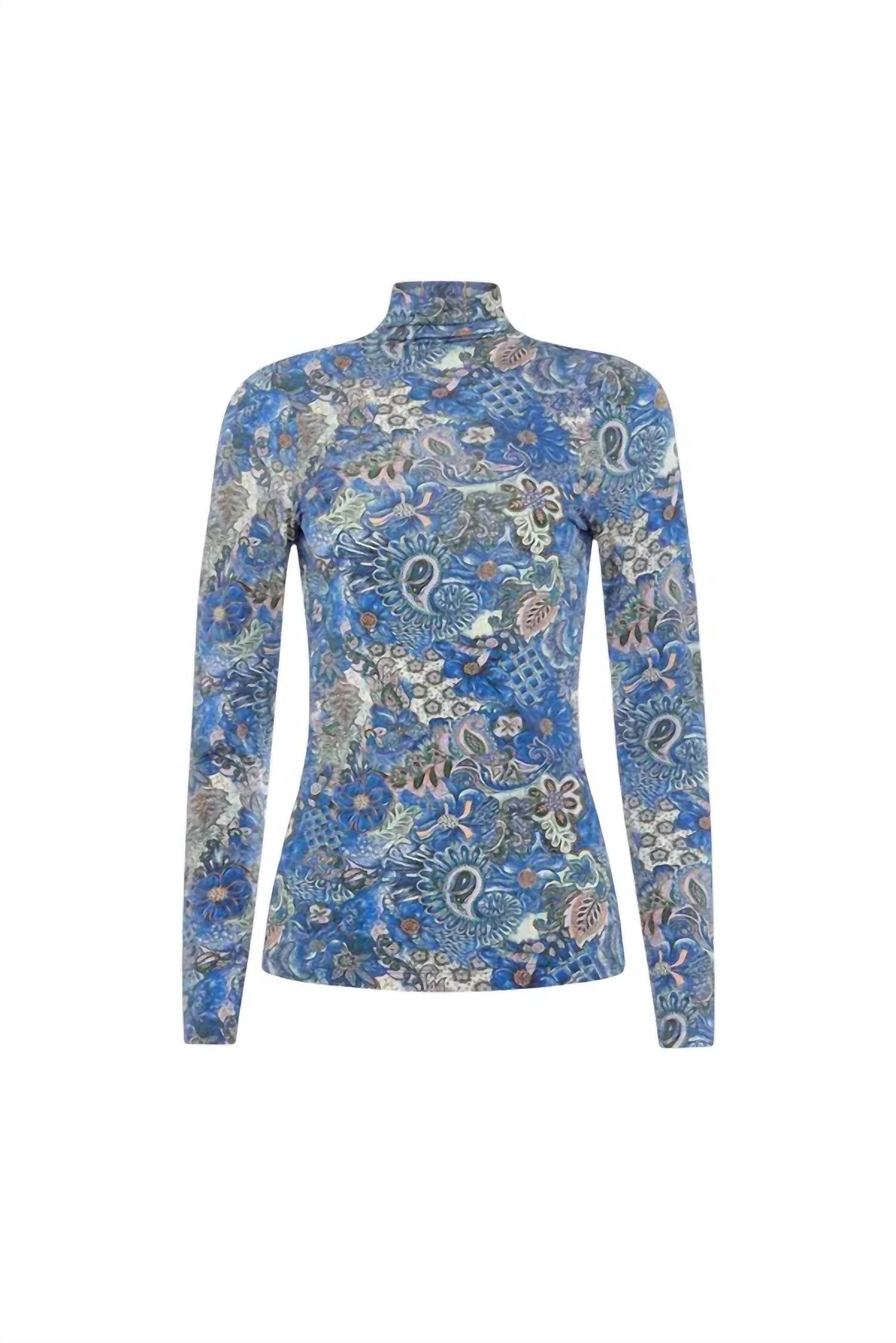 A timeless blouse that will never go out of style. Enhance your elegant attire with the Marie Oliver Eloise Top, a fitted turtleneck blouse in the sophisticated shade of Breeze. This long sleeve piece features a captivating paisley pattern, crafted from a luxurious blend of 95% viscose and 5% elastane, ensuring a comfortable yet stylish fit. With a slip-on closure and unlined finish, this top is perfect for layering or wearing solo. Care for this garment by dry cleaning only, maintaining its timeless charm for sophisticated occasions.