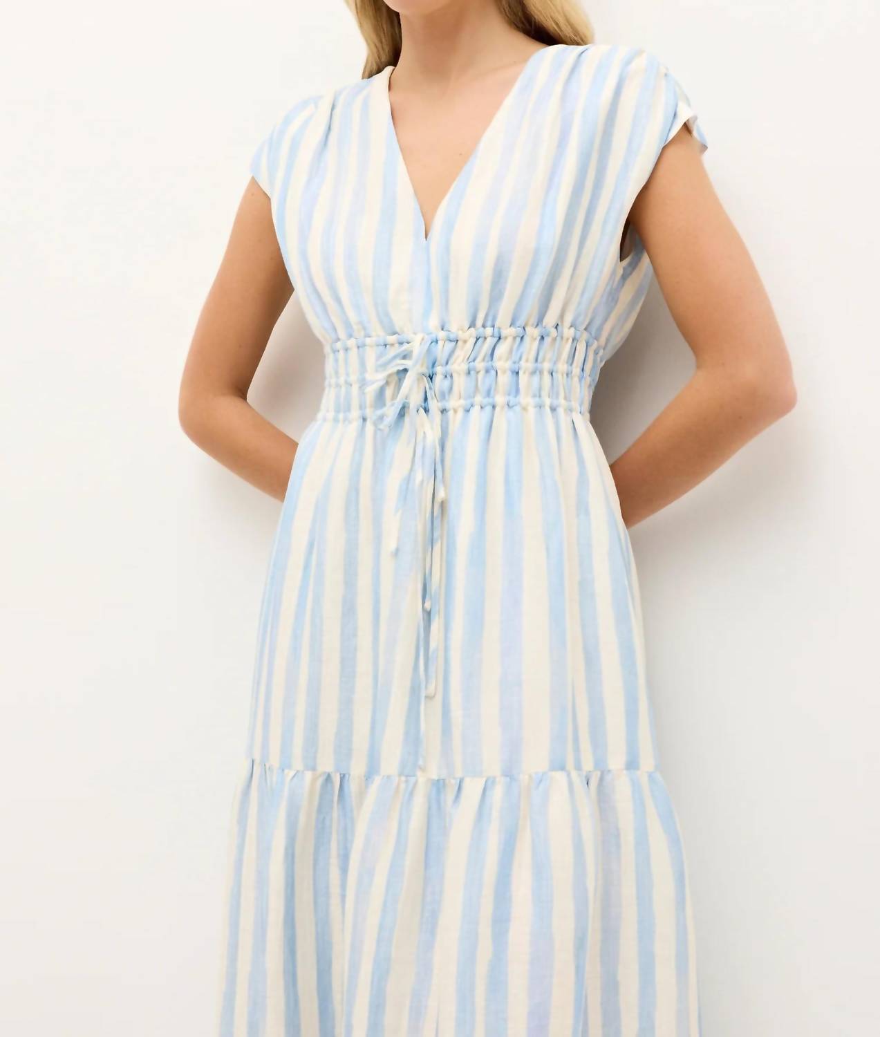Just add slides or mules and you are good to go. Introducing the Indy Midi Dress by Marie Oliver, an enchanting summer essential in Agua watercolor stripe. It features delicate cap sleeves, a slip-on silhouette, and an elastic waist with a drawstring tie, perfectly complementing its lightly flared midi skirt. Composition: 60% Rayon, 20% Linen, 20% Nylon. Closure: Pull on. Care: Hand wash with gentle detergent and line dry or opt for dry cleaning.