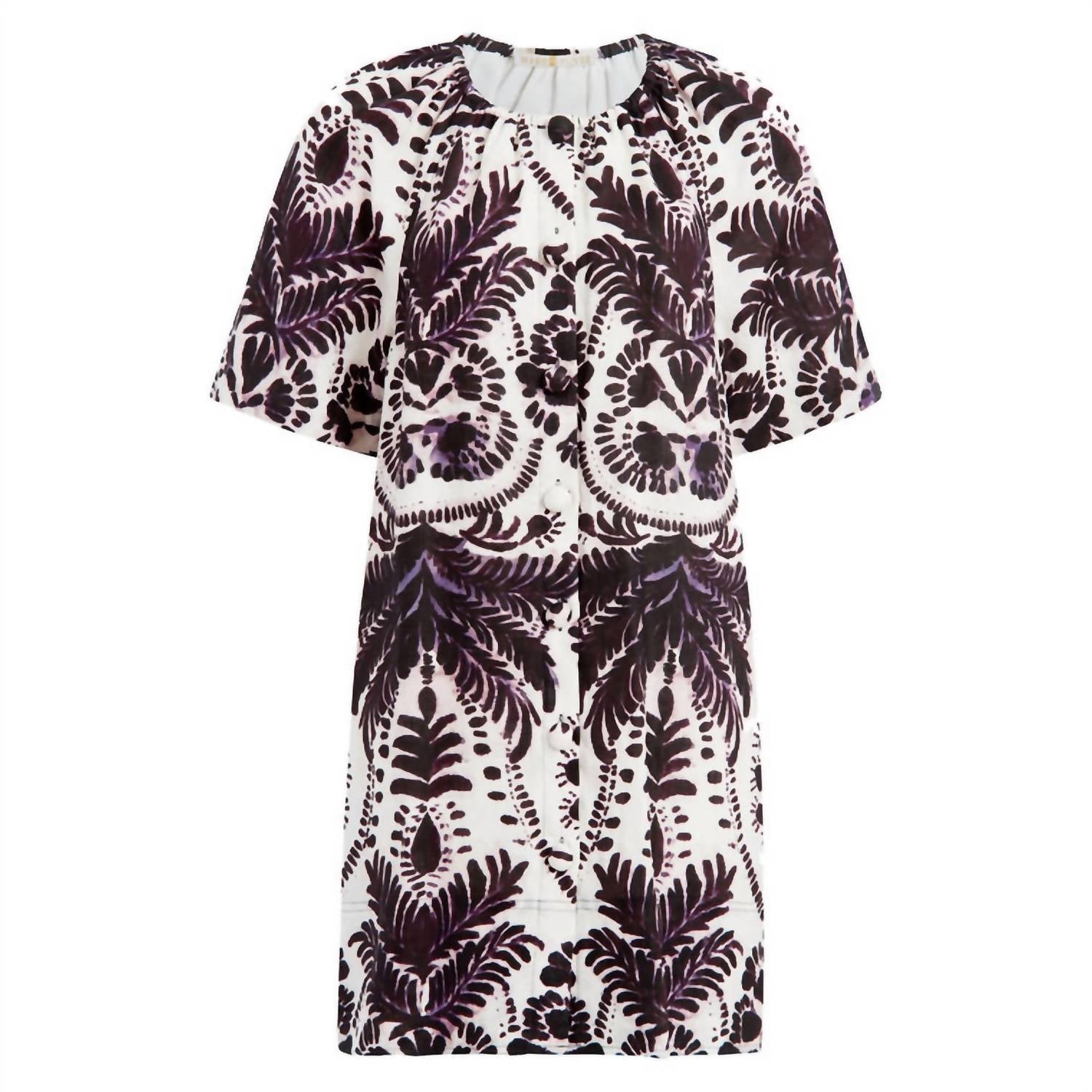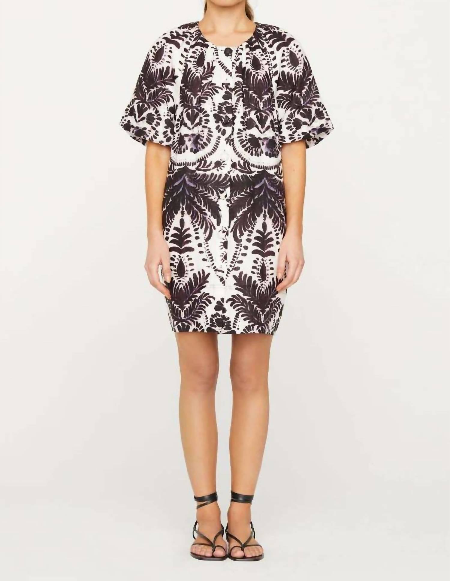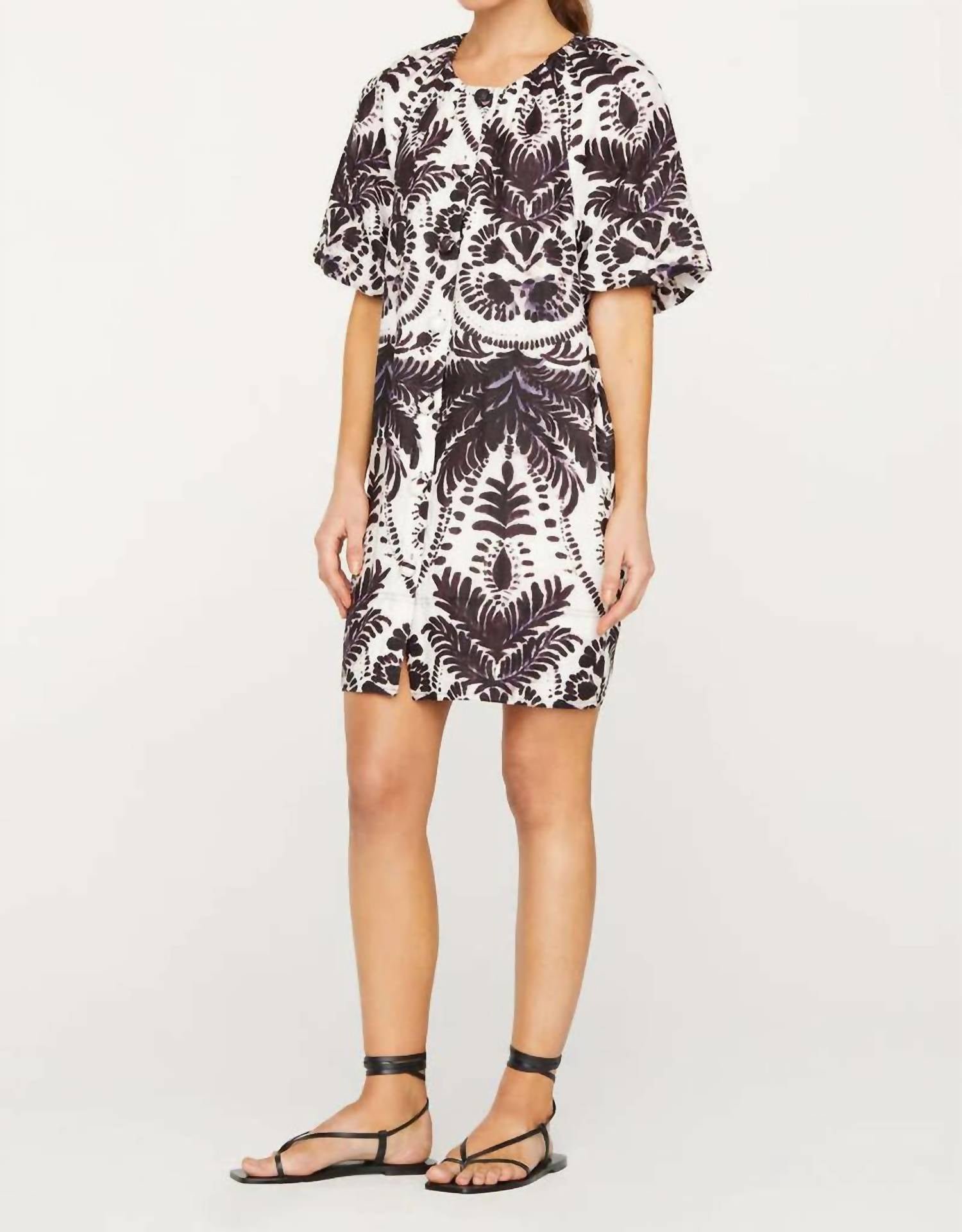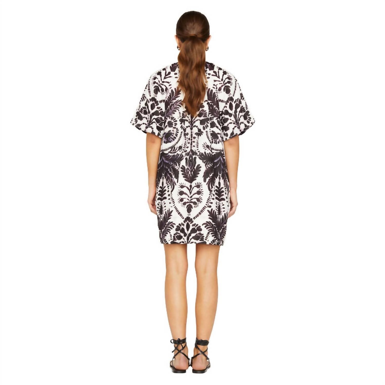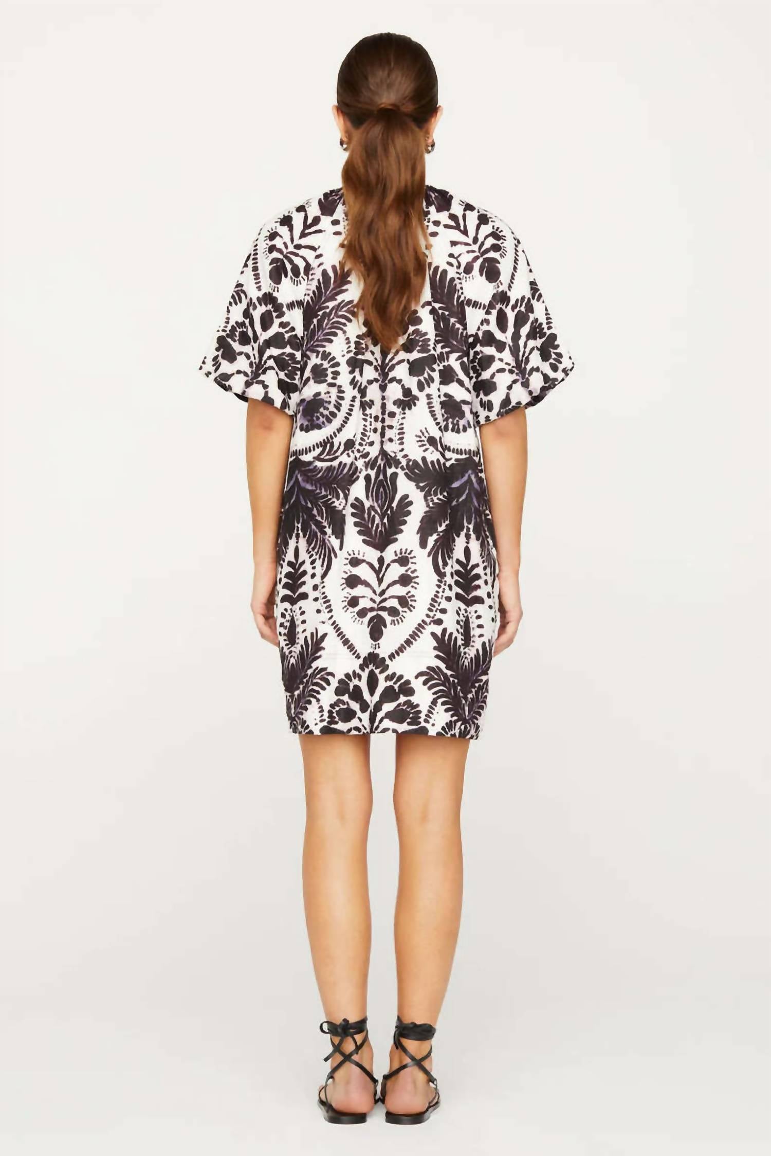 Introducing the Palma Huxley Dress by Marie Oliver, a chic mini dress crafted from premium linen. This women's shift dress features a crewneck design with short sleeves and a patterned print. Made with a convenient button closure, it combines effortless style with practicality. Care for this dress involves machine washing and laying it flat to dry.