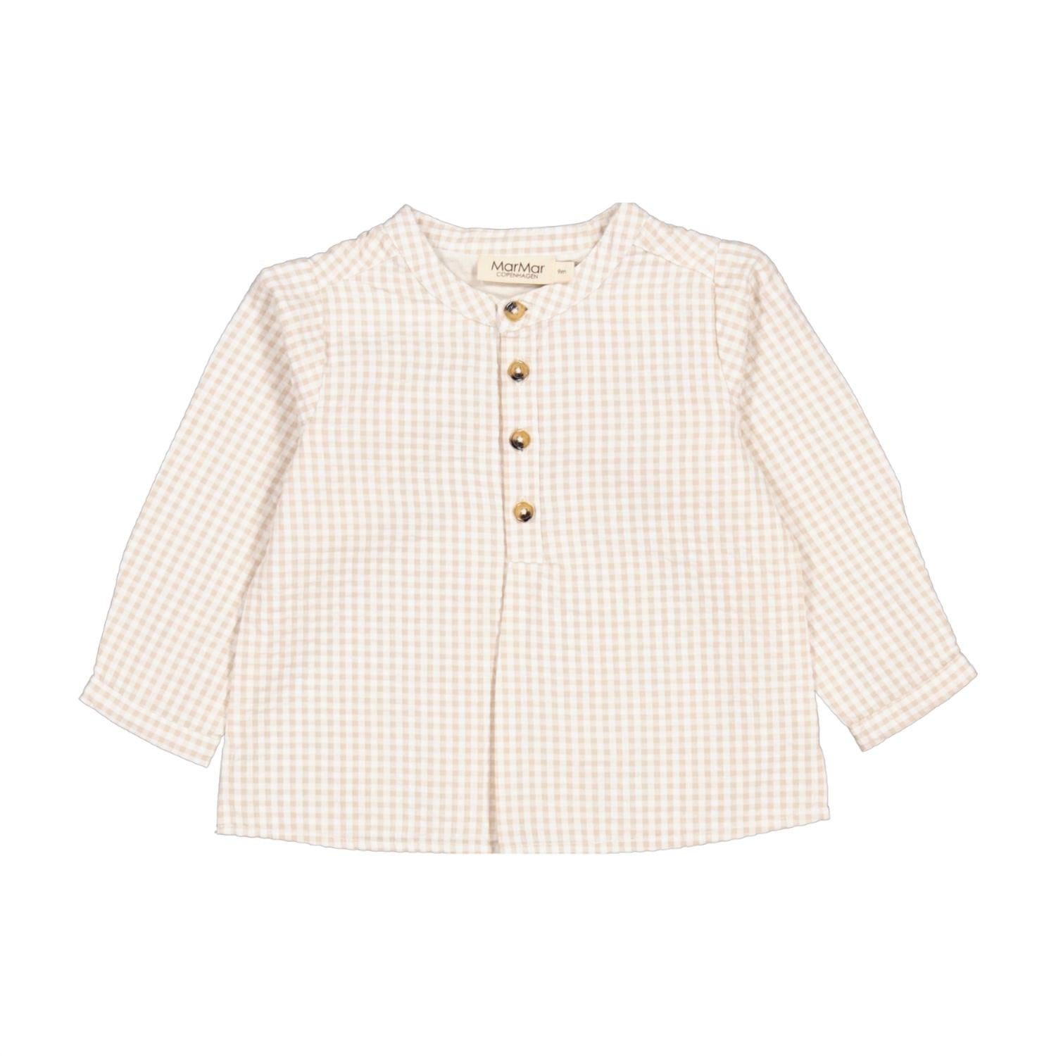 Introducing the Tokyo Checked Shirt by MarMar Copenhagen, a perfect choice for boys looking for minimalist, vacation-ready style in sand. This long-sleeved mao shirt features a classic gingham pattern and is crafted from 100% natural, breathable cotton, making it ideal for hot weather. The shirt, made in Denmark, boasts a button closure for easy wear and is certified according to Standard 100 by OEKO-TEX. For easy care, simply machine wash and tumble dry.