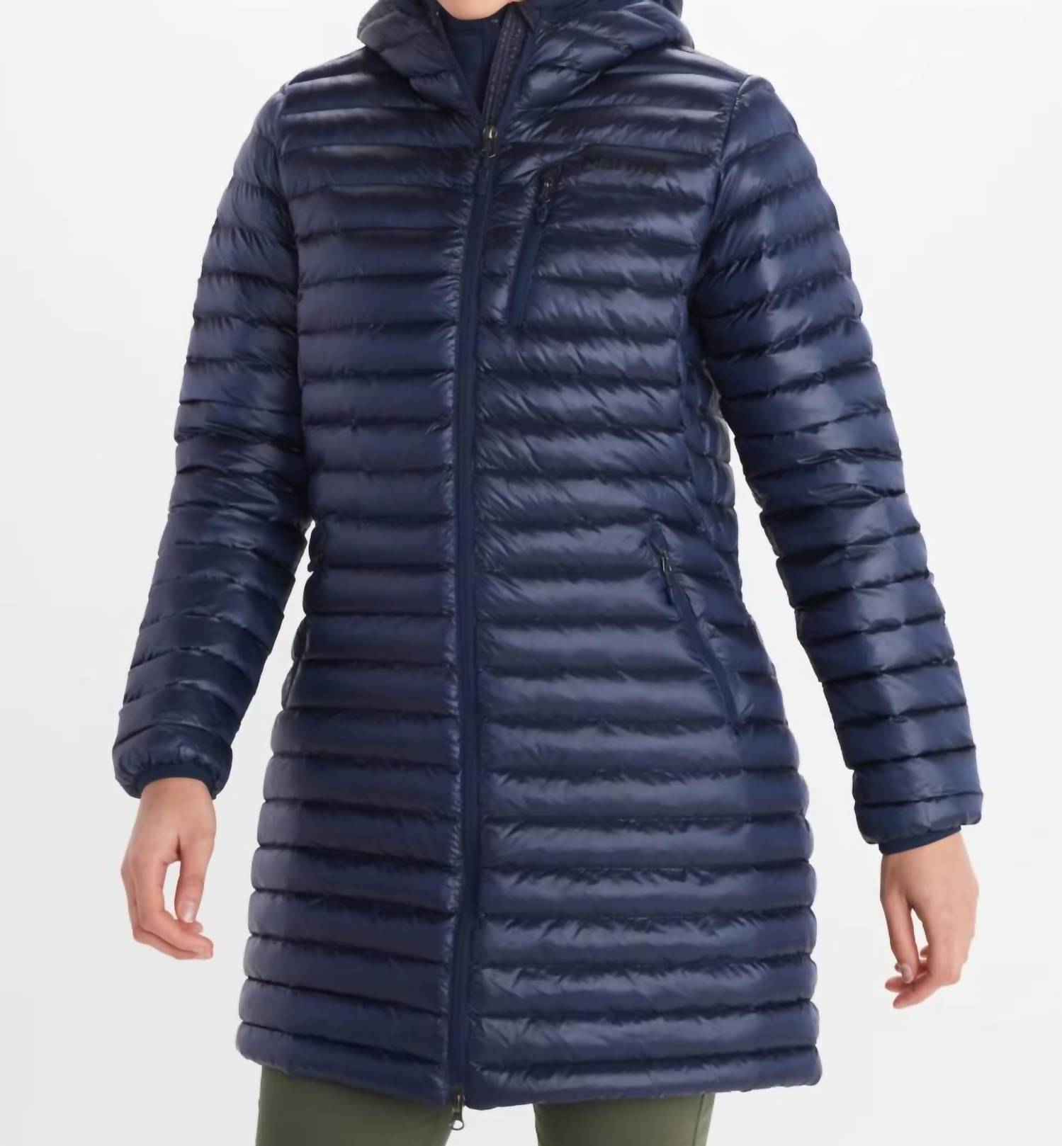 20-denier woven baffle construction prevents the insulation from shifting. Elastic-bound cuffs for close fit and added protection against the elements. Zippered hand pockets. Attached hood with elastic binding. Weight: 499g