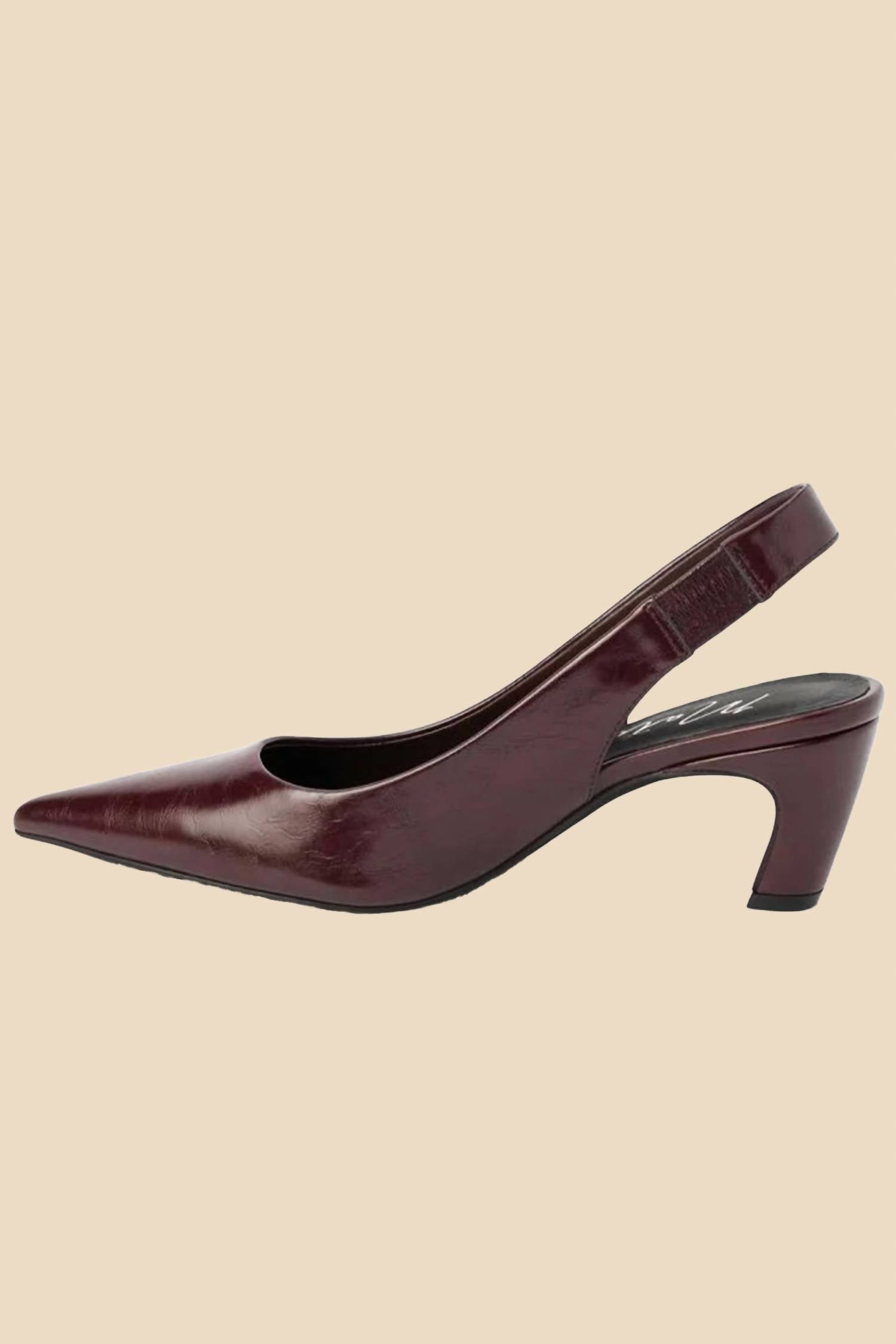 The perfect height for day to night. Step out in style with the Matisse Leona Slingback Heel in a rich Bordeaux hue, designed for the modern woman. These heels feature a faux leather upper with a secure slingback strap complete with an elastic insert, ensuring comfort with every step. The pointed toe and approximately 1.5-inch heel height elevate your look effortlessly. Crafted from synthetic materials, these striking heels are a chic addition to any closet.