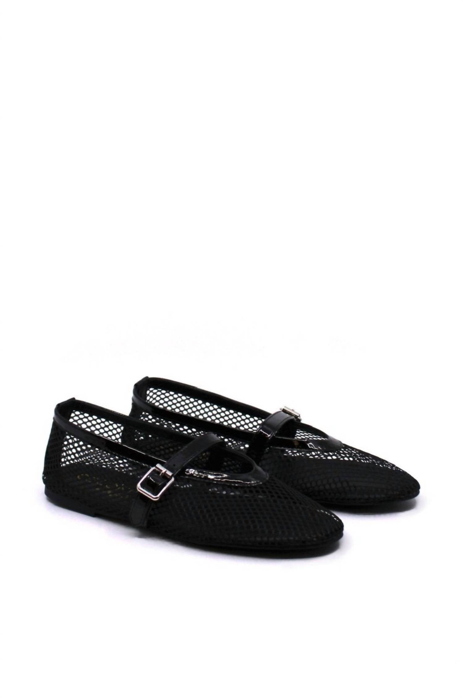 Chic flats feature a black vegan fishnet design with a stylish almond toe, perfect for adding edginess while embracing quiet luxury. Mary Jane ballet flats have a textile upper, a manmade outsole, and a padded insole, providing both comfort and style. Buckle closure.