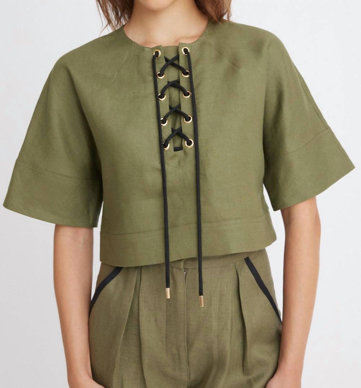 Show a little skin in this cute and casual crop top. The Anorak Short Sleeve Top by Matthew Bruch is an ideal addition to your summer wardrobe with its army linen hue and solid, clean design. Made from high-quality linen, this crop top features a classic crewneck and effortlessly stylish short sleeves. Closure is a simple pull-on style, emphasizing convenience and comfort. For optimal care, dry cleaning is recommended, ensuring this piece retains its impeccable look for holiday parties and workwear alike.