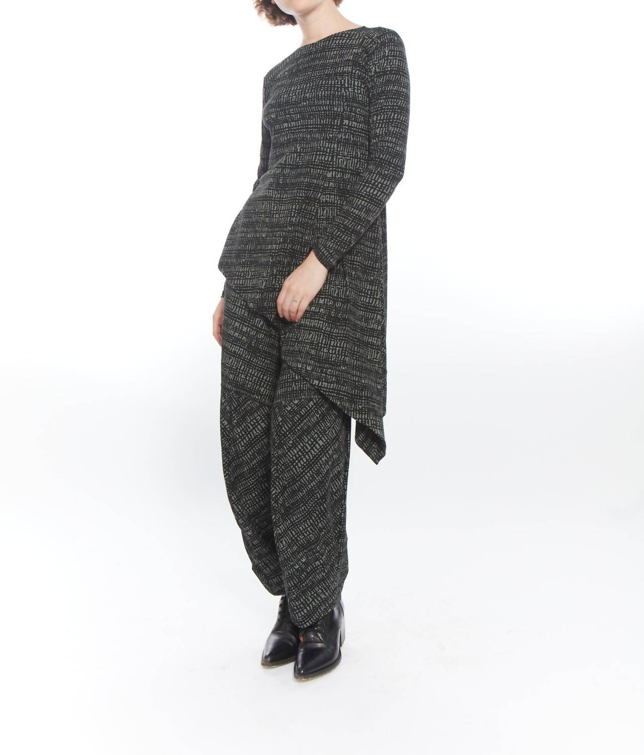 Great fit, cute design, soft fabric. You'll love everything about this long sleeve tee. Elevate your wardrobe with the Aubrey Asymmetrical Top by Matthildur, perfect for a sophisticated everyday look. Featuring long sleeves and a chic boatneck, it's crafted from luxurious Peruvian Cotton Lycra. The patterned Black Stone Print adds a unique flair, while the pull-on style ensures ease and comfort. Care instructions: Machine wash and tumble dry.