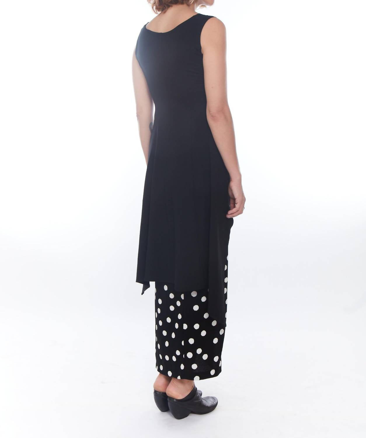 Experience the elegance of the Madelyn Sleeves Top by Matthildur, a standout piece in the MxM Collection. This black blouse features a scoopneck and a sophisticated asymmetrical front, with an extended back reaching the knee. Crafted from high-quality cotton, it's sleeveless but pairs effortlessly with a bolero for added coverage. Closure: Pull on. Care: Machine wash and tumble dry.