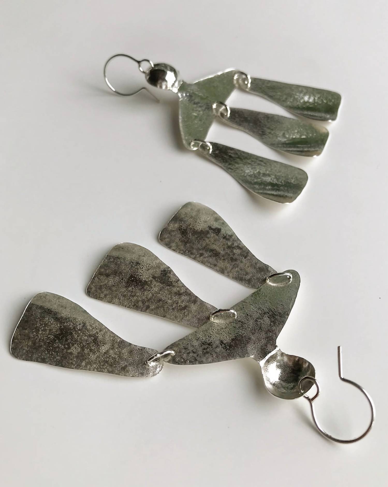 Easy and elegant earrings to complement any outfit. Introducing the Women's Three Golden Trees Earrings by McKinley Mizar, a captivating accessory designed to dazzle. These fashion earrings are crafted from sterling silver, featuring an S-hook closure for a secure fit. With a sophisticated length of 3 inches and a width of 2.25 inches, they showcase expertly hammered and formed organic-shaped dangles for a striking statement. Elevate your ensemble with these lightweight, silver statement pieces that promise enchanting light-catching movement.