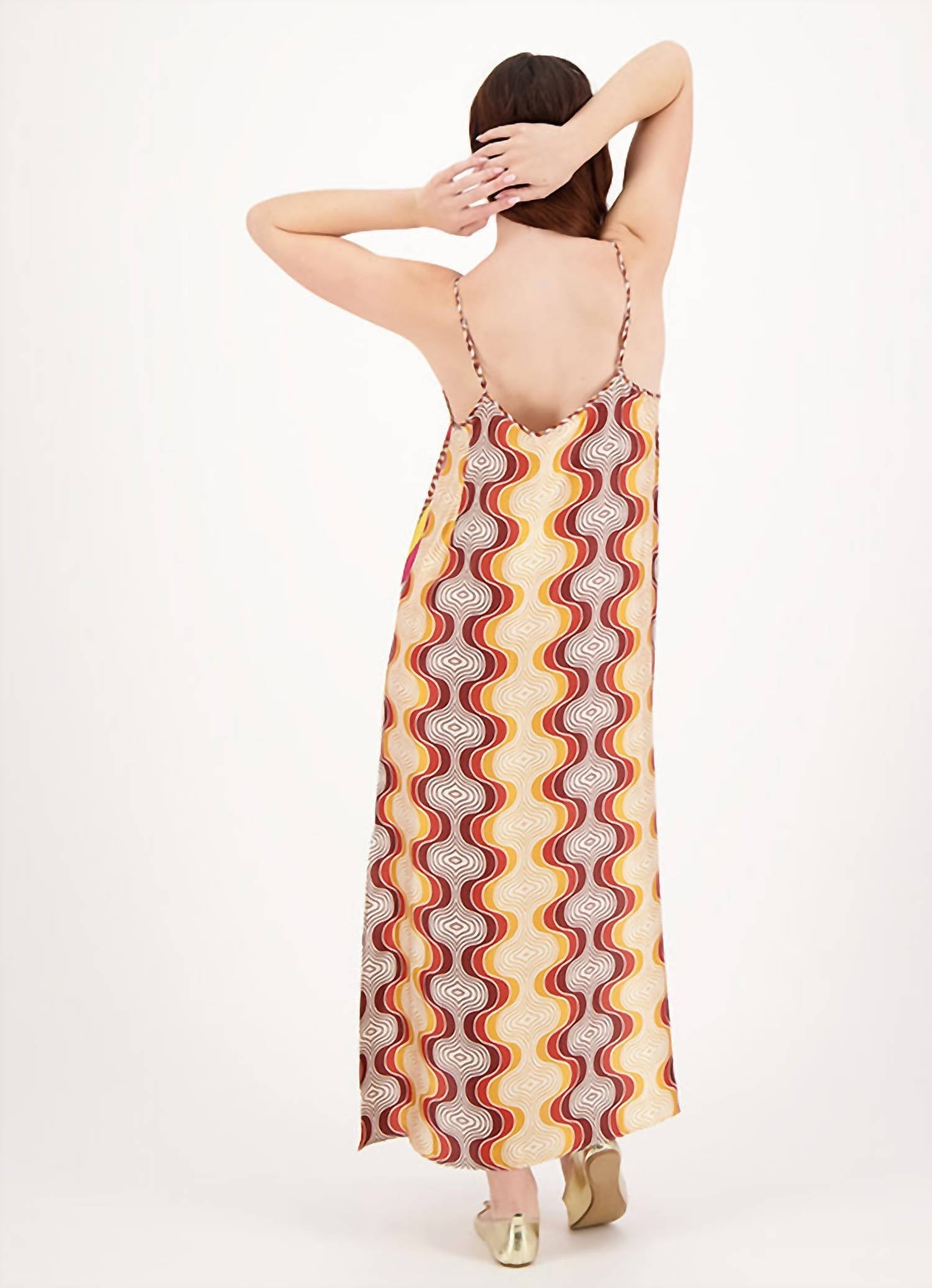 Style this maxi with your favorite statement necklace and sandals for the perfect look. Introducing the Olivia Camisole Dress by Me369, a sophisticated shift silhouette designed for effortless summer style. This orange maxi dress features spaghetti straps and a flattering V-neckline, perfect for vacation wear. Crafted from 100% viscose for a lightweight feel, it showcases a graphic pattern in a Boho Chic trend. Closure: Pull-on.