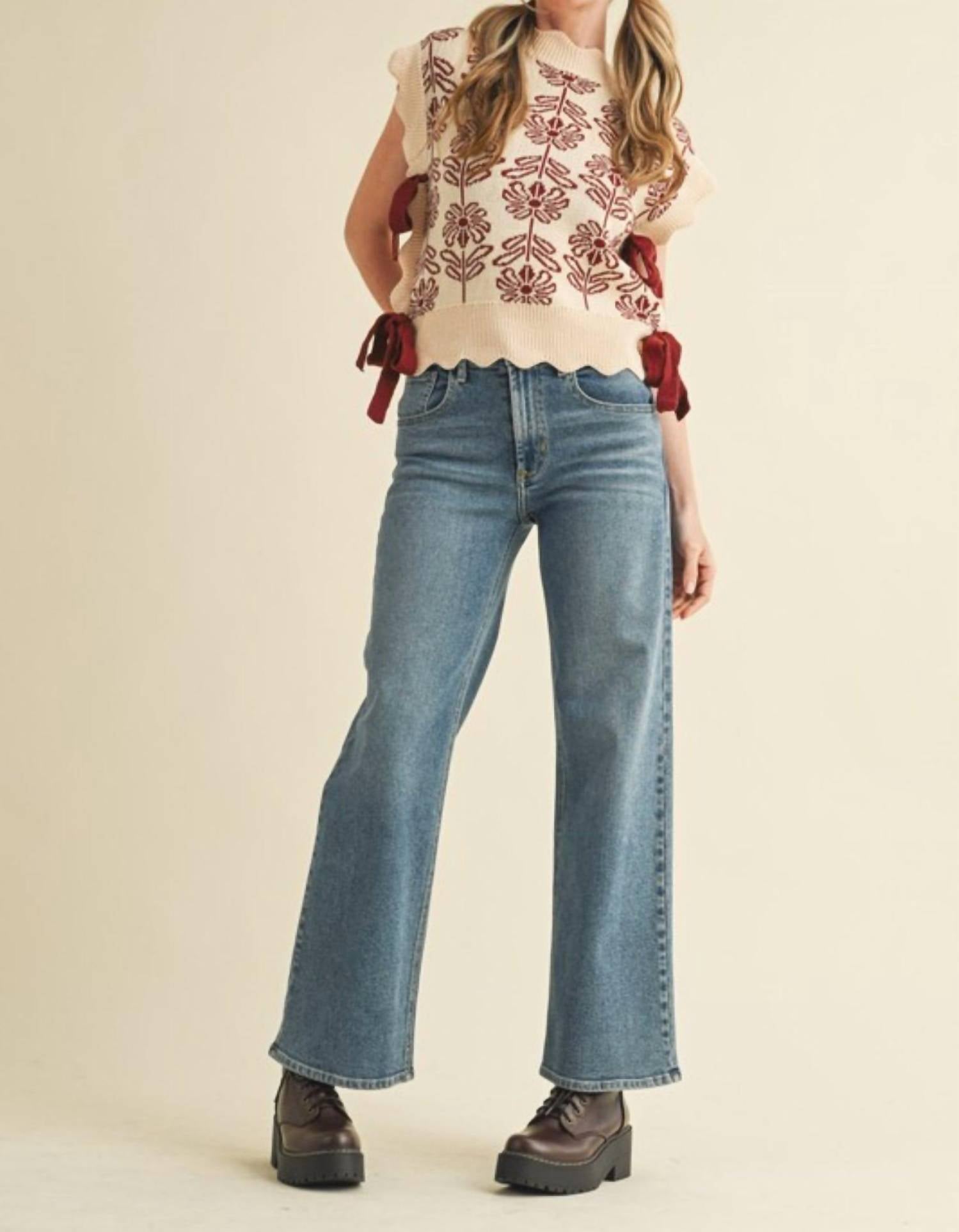 Introducing the Brianna Sweater Vest by &merci, a trendsetting piece in a rich caramelized tone designed to elevate any ensemble. This sleeveless knit vest features a floral pattern with a ribbed scalloped mock neck and hem, complete with contrast knit side ties for added flair. Pockets offer functional style, making it perfect for a fall vacation or Thanksgiving gathering. Care instructions: Machine wash and lay flat to dry. Available sizes: Small (4-6), Medium (8-10), Large (12-14). Model is 5'10.5", wears size S (32-24-36).