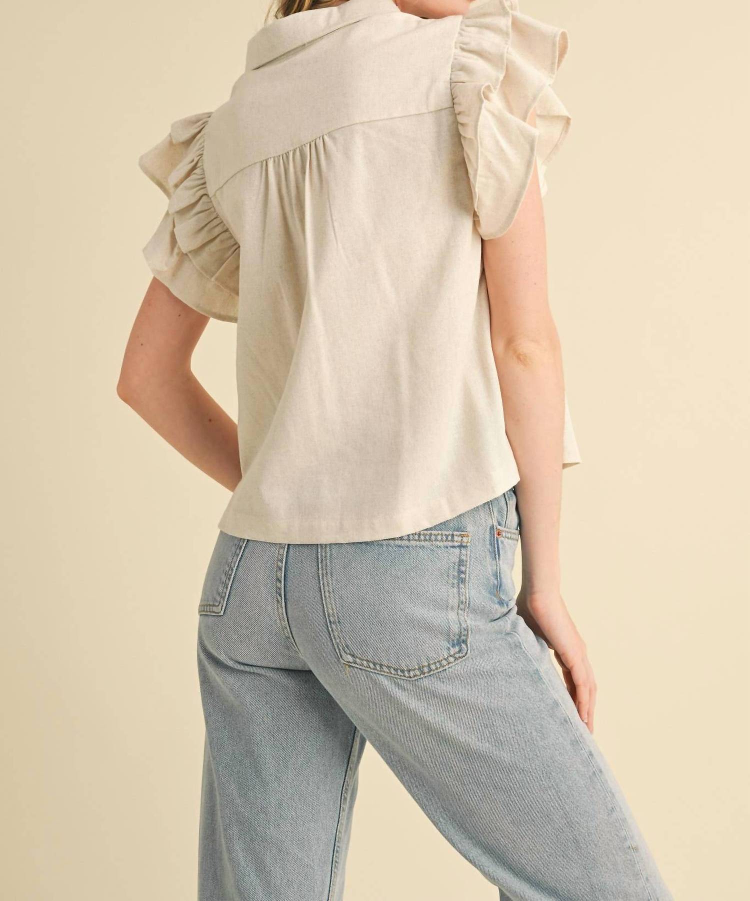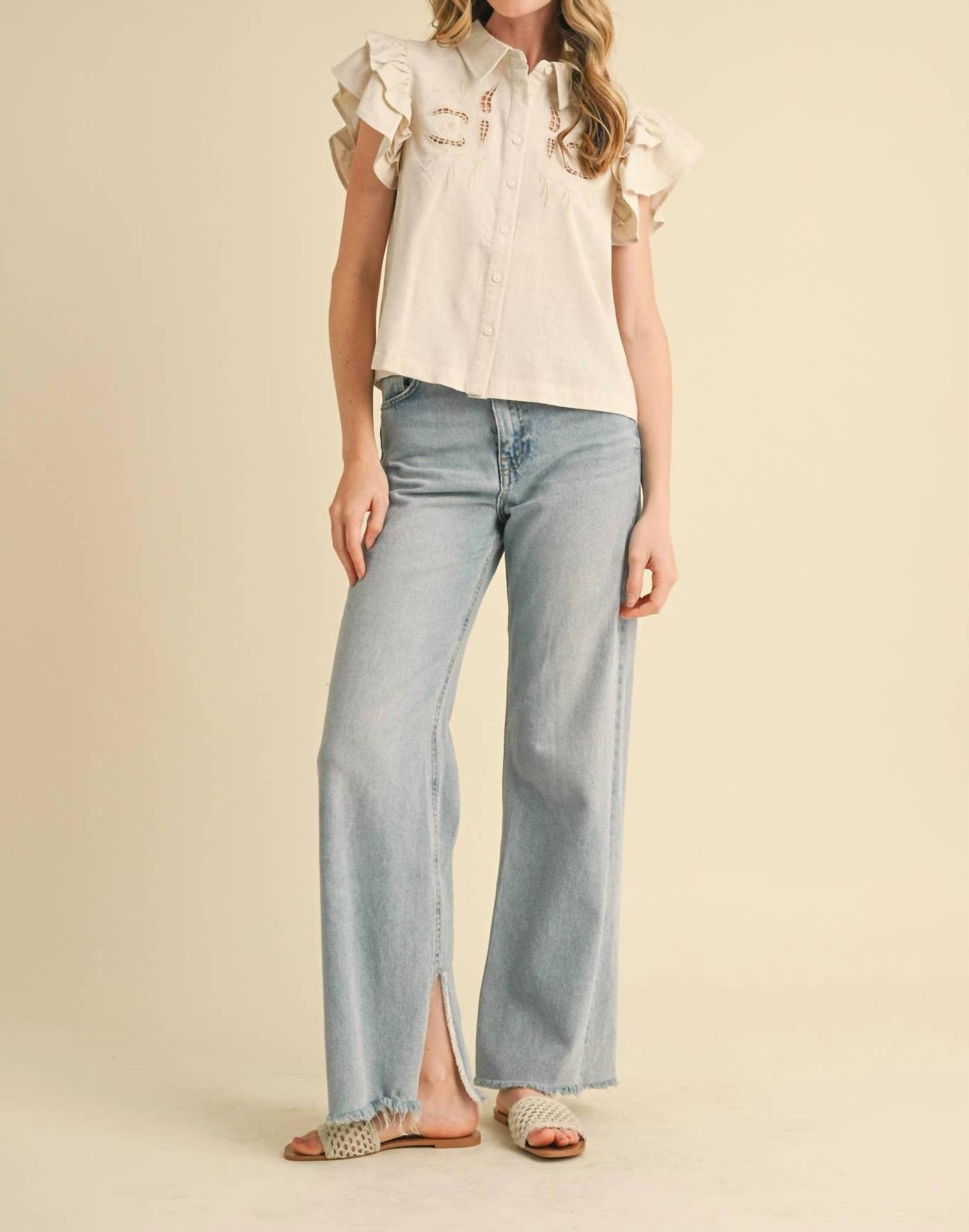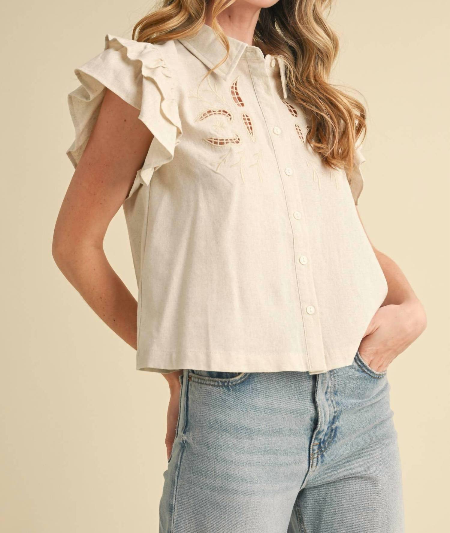 Pair this with your favorite jeans and slides for your next girls night out. Enhance your wardrobe with the Carrie Top by &merci, an elegantly textured blouse in vibrant red. Crafted from a Viscose Blend, this women's top features short tiered ruffle flutter sleeves and an embroidered cut-out design, creating a relaxed yet sophisticated fit. With a classic collared neckline and button closure, it effortlessly combines style with detail. Care: Machine wash, line dry. The model is 5'10.5", with measurements 32-24-36, wearing a size small.