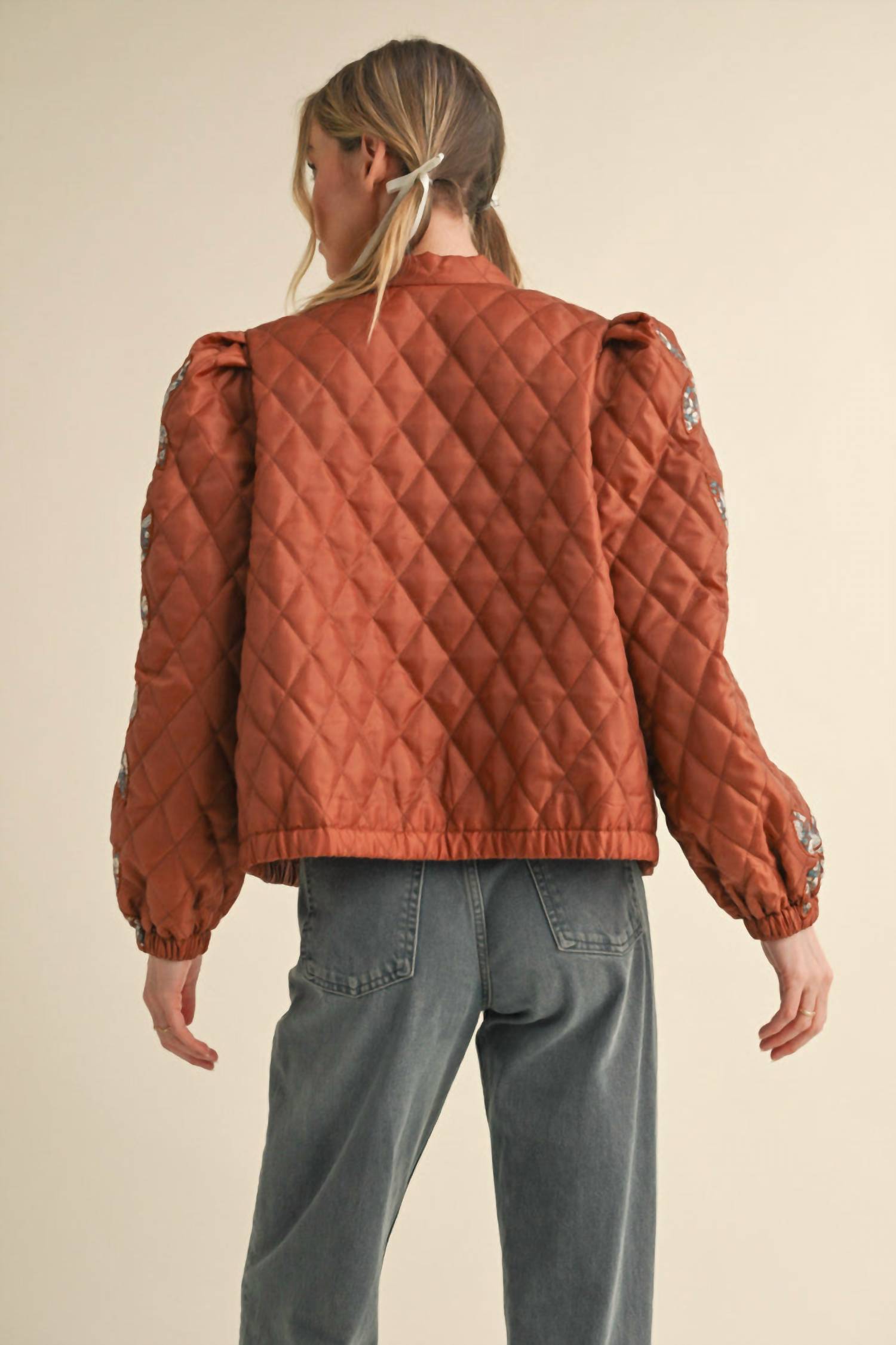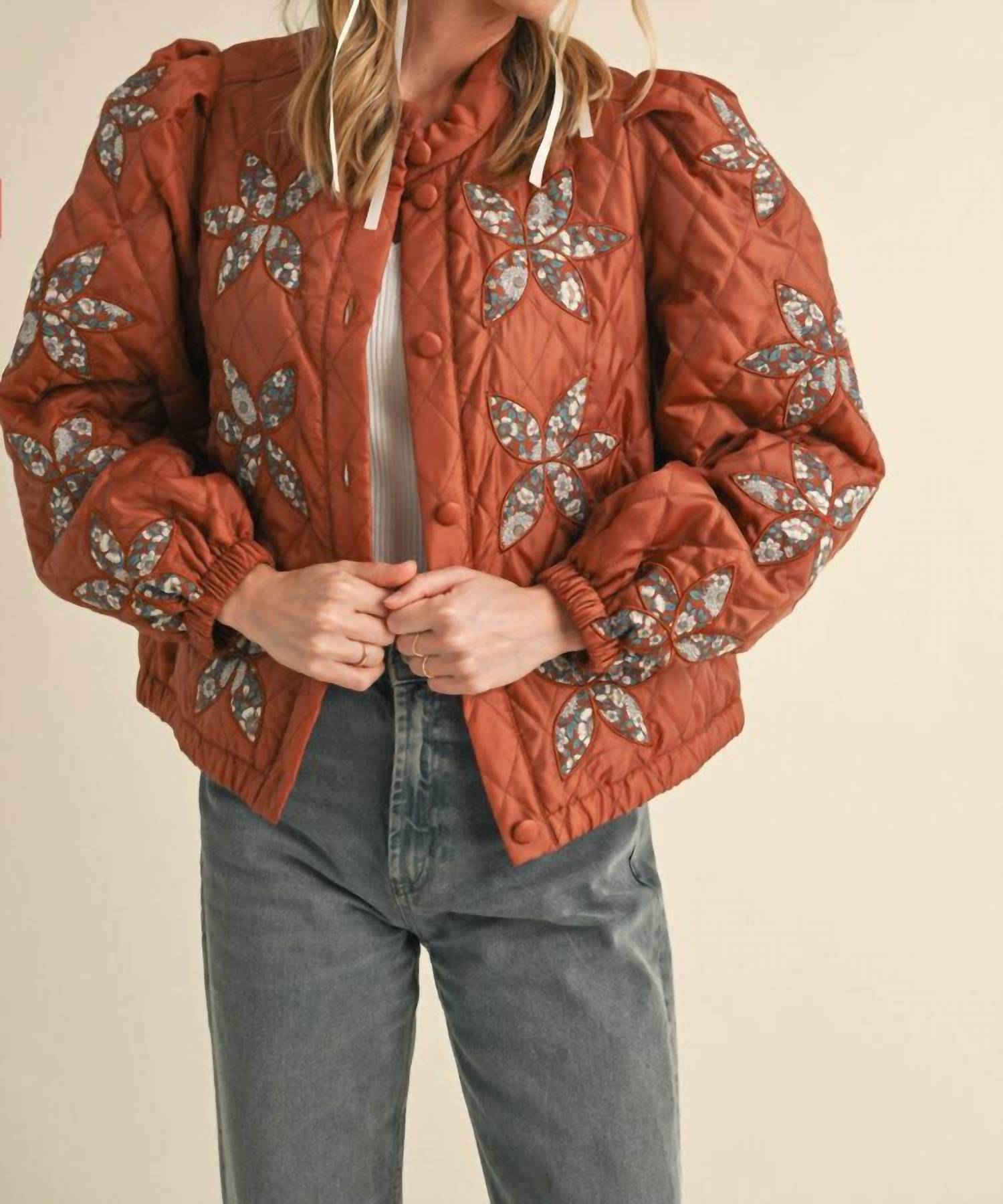 A jacket so versatile you can literally wear it with anything. Elevate your style with &merci's Grandma's Favorite Quilted & Floral Jacket in elegant rust. This long-sleeve jacket features a stunning embroidered floral patchwork design that exudes charm and sophistication, while elastic cuffs and gathered puff shoulders add a playful touch. The jacket is crafted with a practical button closure and includes convenient side pockets, making it a perfect blend of functionality and fashion. Lined for extra comfort, this stylish piece is a must-have for your casual wardrobe.