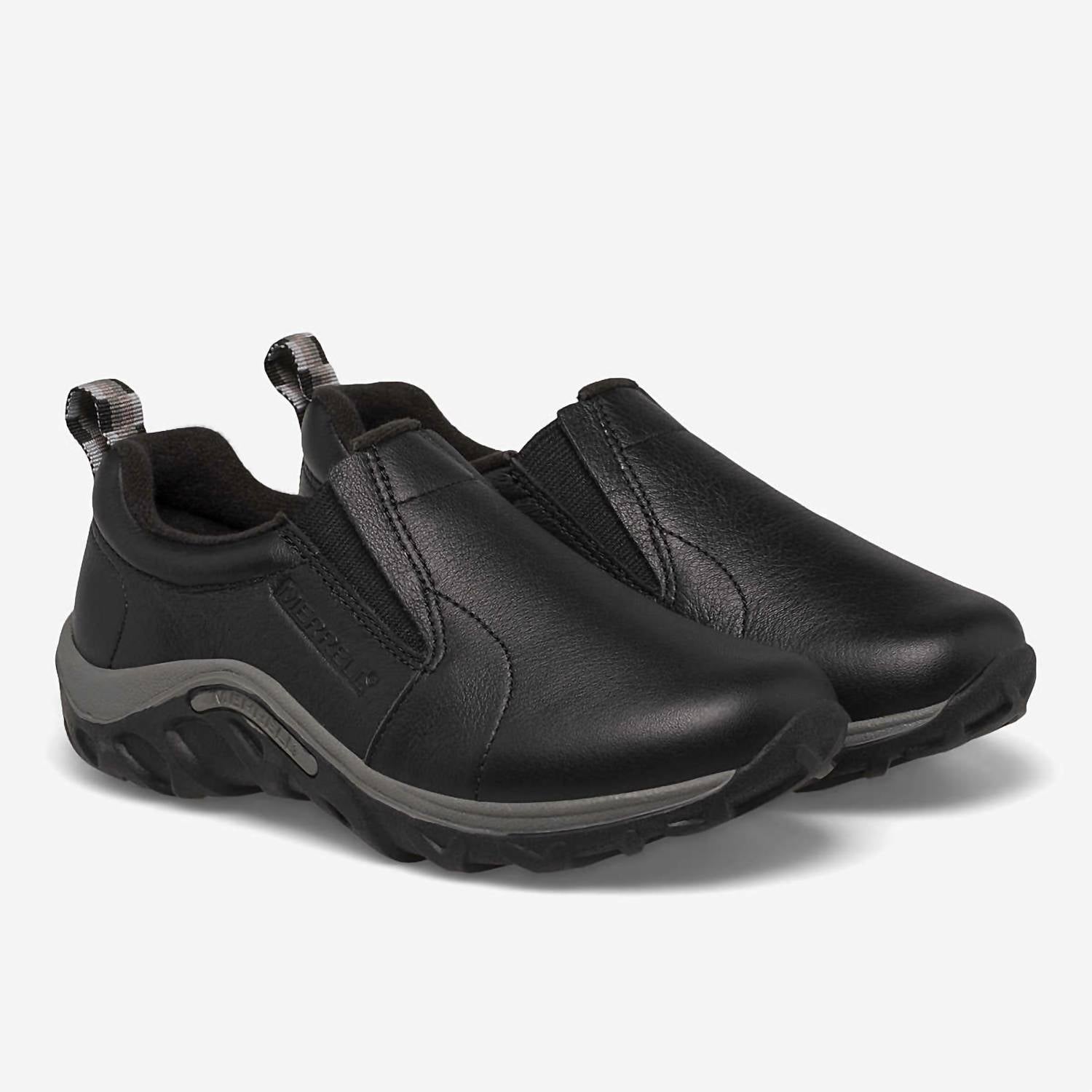 Introducing the Kids Jungle Moc Leather by Merrell, a versatile slip-on sneaker in classic black designed for both adventure and everyday wear. Crafted with a durable leather upper and featuring 100% recycled PET linings, this shoe stands out with its eco-friendly components. Enjoy the ease of its slip-on style and the security of a flexible, non-marking outsole that offers extra grip. Additionally, the anti-stink lining ensures freshness every step of the way, making it an ideal choice for young explorers.