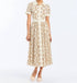 Introducing the Billie Collared Shirt Dress by Mestiza New York, a harmonious blend of timeless tailoring and feminine charm. This short sleeve, cotton midi-length dress showcases a signature Quatrefoil Tile print in brown, enhanced by a crisp collared neckline and contrast ivory trim. With a pleated A-line silhouette, it offers effortless elegance for work or special occasions. Featuring a zip closure, this piece is dry clean only and precisely tailored for the modern woman.