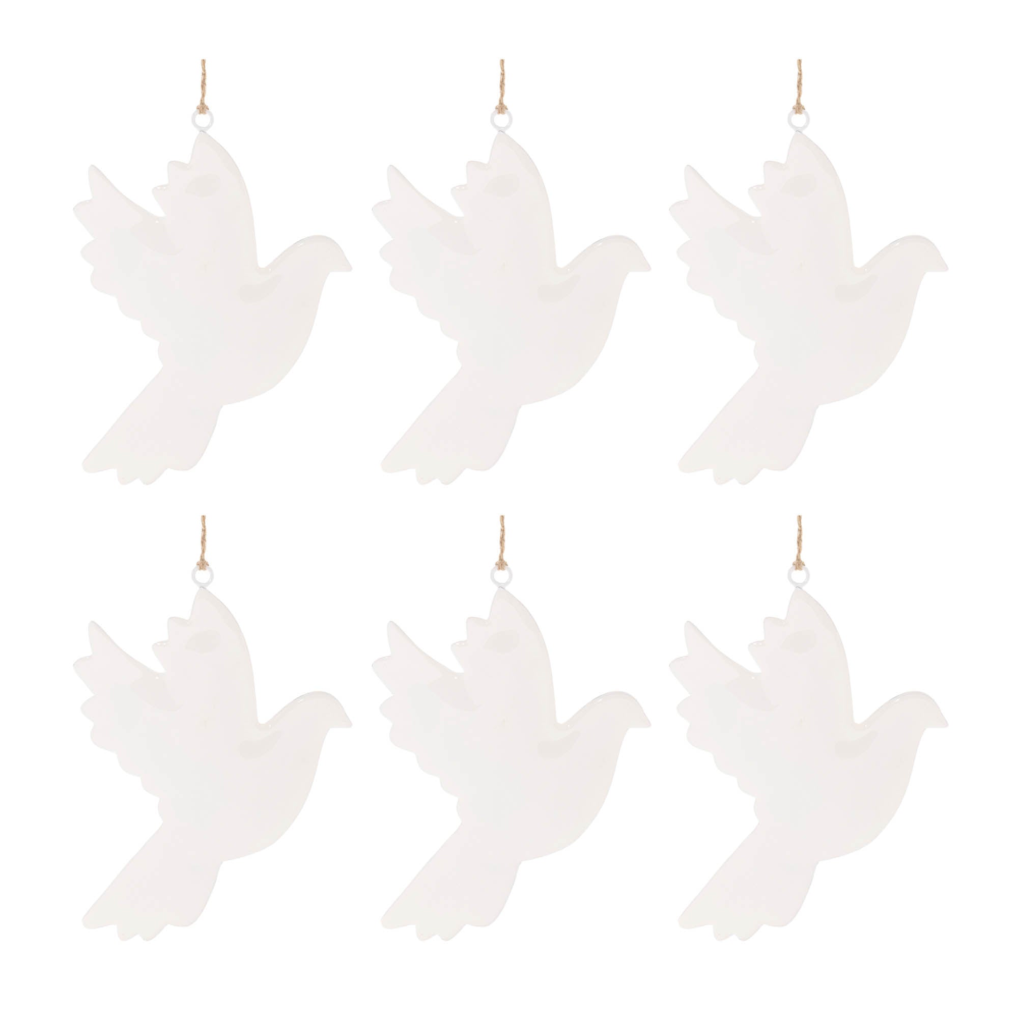 Add a touch of traditional holiday cheer with the Metal Dove Bird Ornament. Crafted in wintry white tones with a glossy finish, this elegant dove shape brings a serene beauty to your Christmas tree. Each ornament features a rustic jute string hanger for easy display. Sold in a set of 6 matching pieces, these doves are perfect for enhancing your holiday decor or for gifting to spread the spirit of Christmas to loved ones.